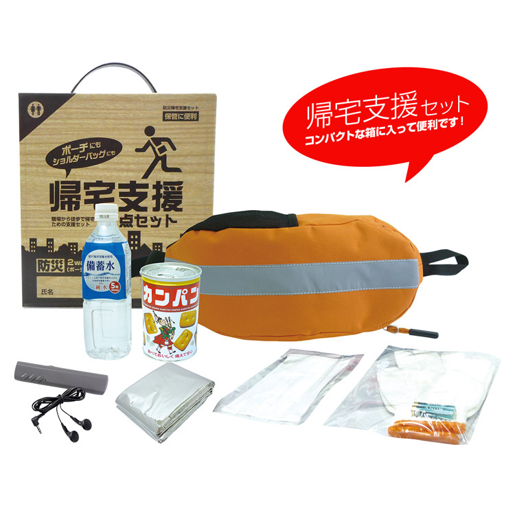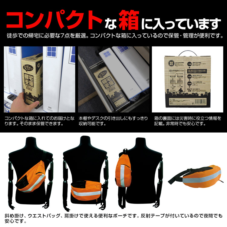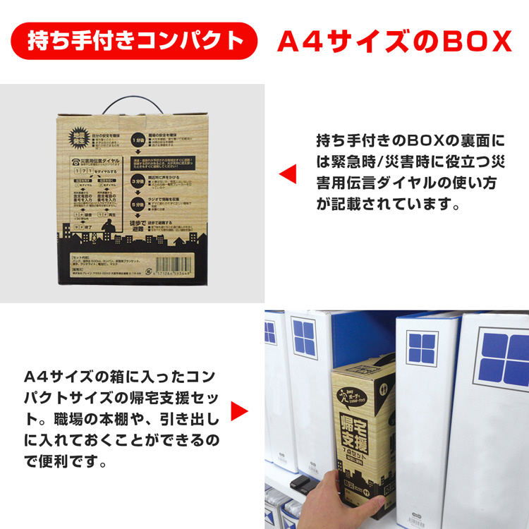 コンパクトなサイズの箱に入ったコンパクトな防災帰宅支援セットです。