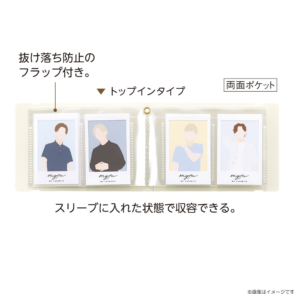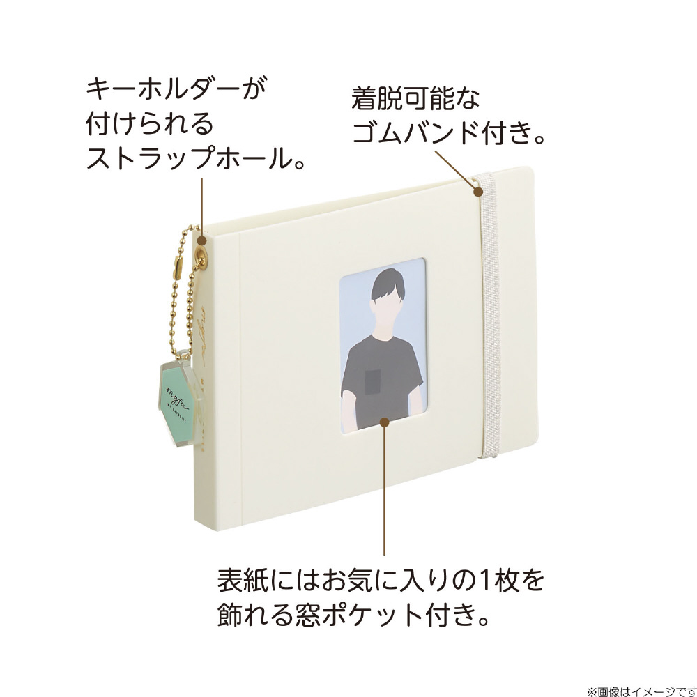 写真が綺麗に見える高透明ポケット。チェキの保管・収容に。持ち運びに最適なミニサイズ。トップインタイプ。抜け落ち防止のフラップ付き。キーホルダーが付けられるストラップホール。着脱可能なゴムバンド付き。表紙にはお気に入りの1枚を飾れる窓ポケット付き。スリーブに入れた状態で収容できる。収容量に合わせて背幅が広がる。※「チェキ」は富士フイルム株式会社の登録商標です。
