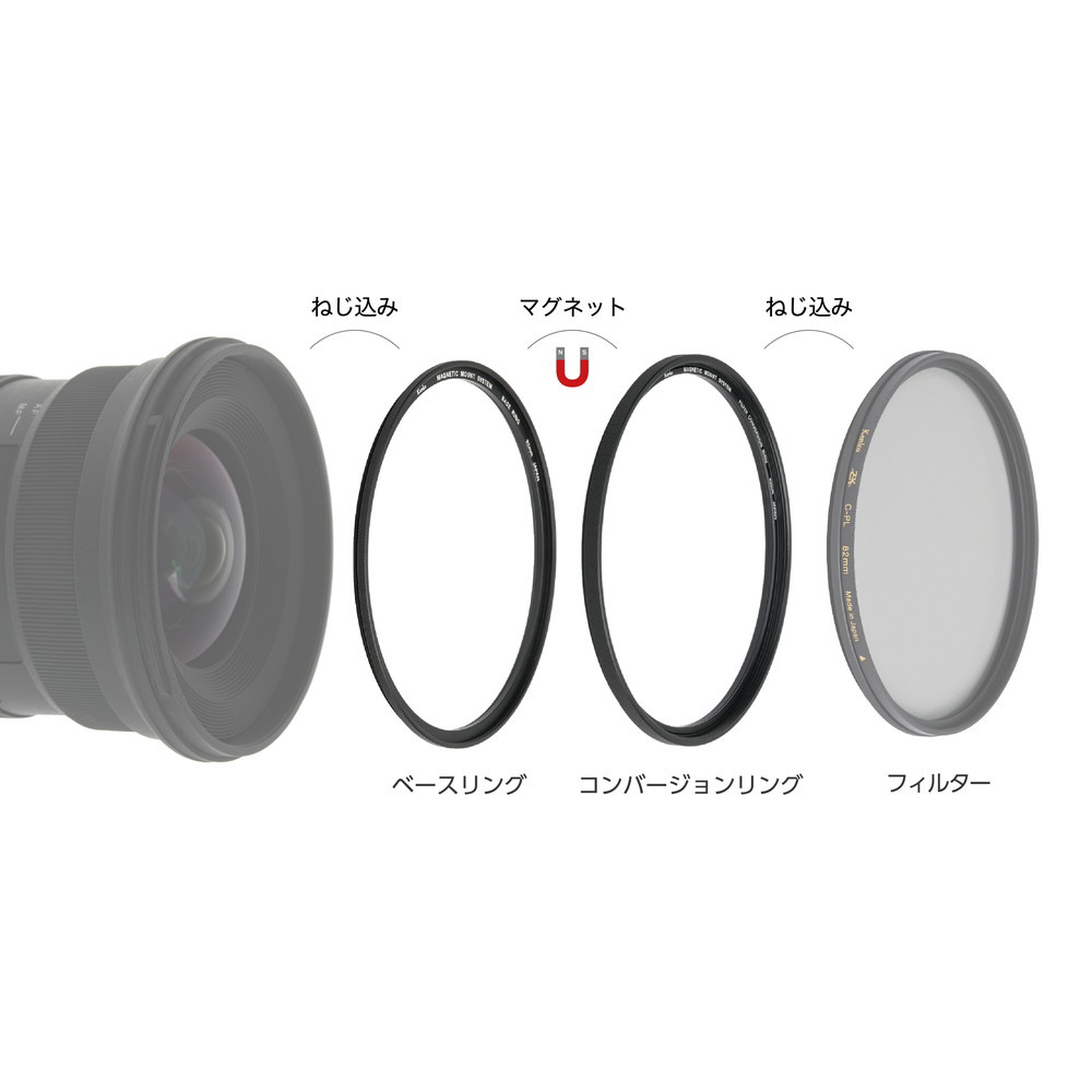 「ベースリング」と「コンバージョンリング」を使用することで、お持ちのねじ込み式フィルターをマグネット着脱式に変換することができます。