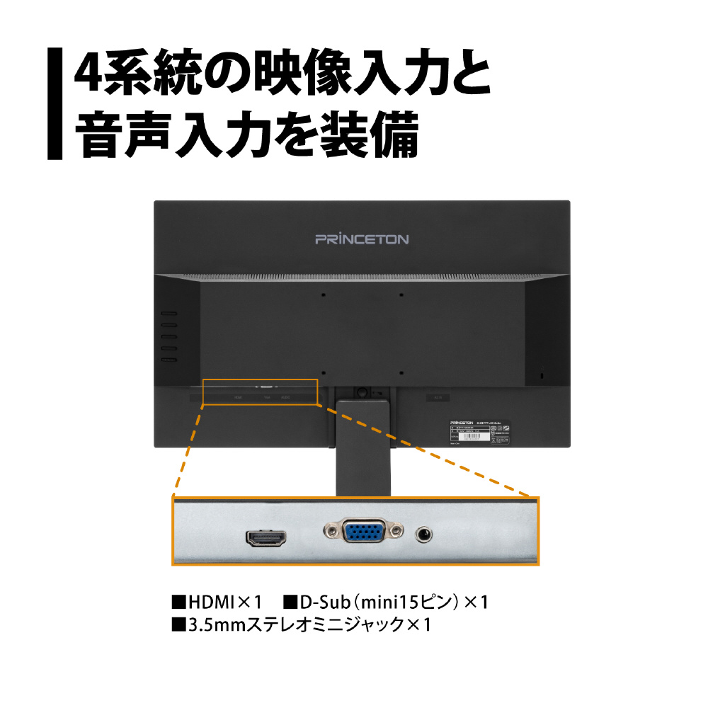 HDMI x1、D-Sub x1の映像入力端子と、オーディオ入力 x1の音声端子を搭載しています。