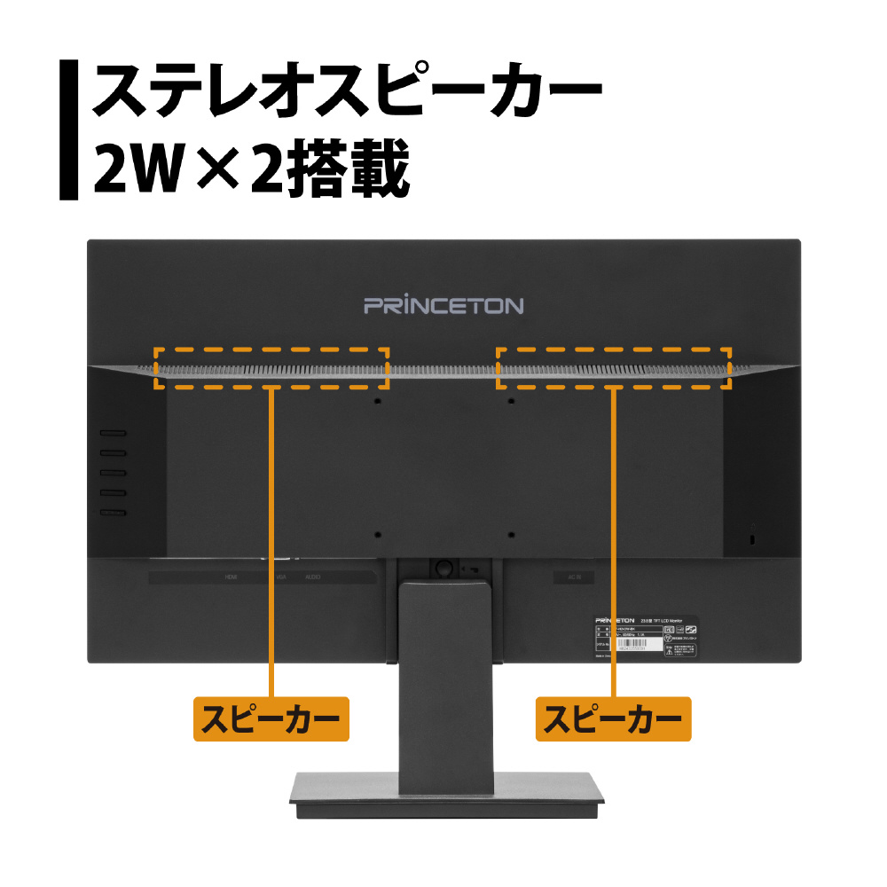 オーディオの入力端子を装備し、ディスプレイ背面上部に、スピーカー(2W x 2) を内蔵しています。