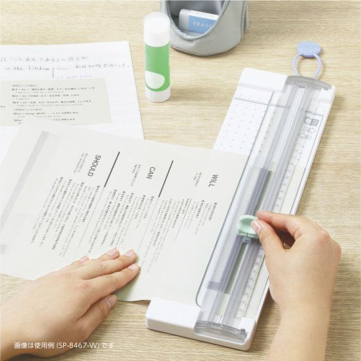 ・B5ノートにおさまるカットガイド付(A4&B5プリント対応)・安全ロックに!シリコンバンド付。替え刃は「SP-8531 プリントカッター 専用替え刃 2個入」をお求めください。(※替え刃のカラーはグリーンのみ)