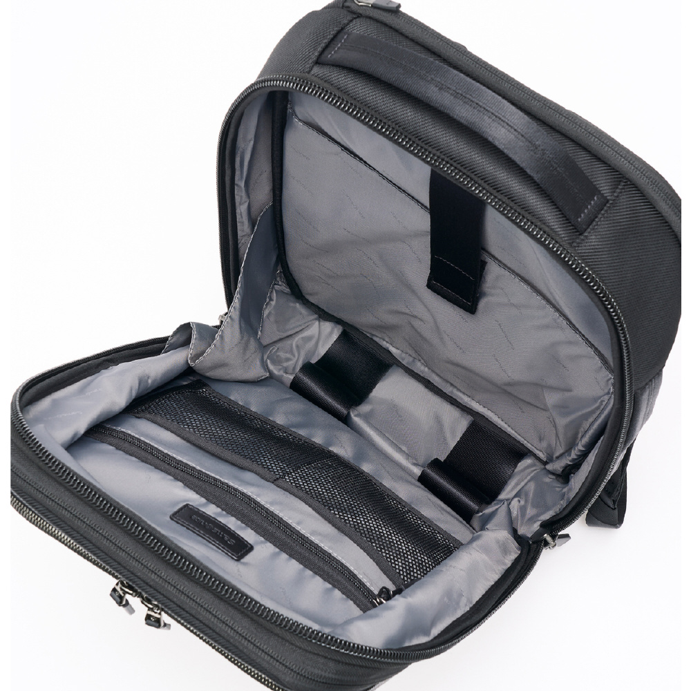 サムソナイト・JET BIZシリーズからの、ビジネスや旅行などさまざまなシーンで活躍する高機能なビジネスリュックです。エキスパンダブル機能により、収納部の奥行きを6cm拡張でき、急な荷物の増加にも柔軟に対応します。拡張時に落ち込みを防ぐガードテープが内装底部に装備されているため、安心して荷物を整理できます。