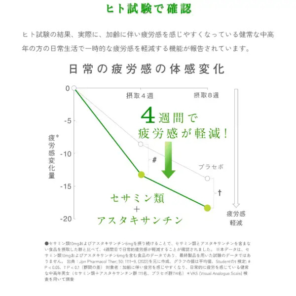 カラダのサビを取る成分(セサミン・アスタキサンチン)により、疲労感の根本的な対策が出来る商品です。