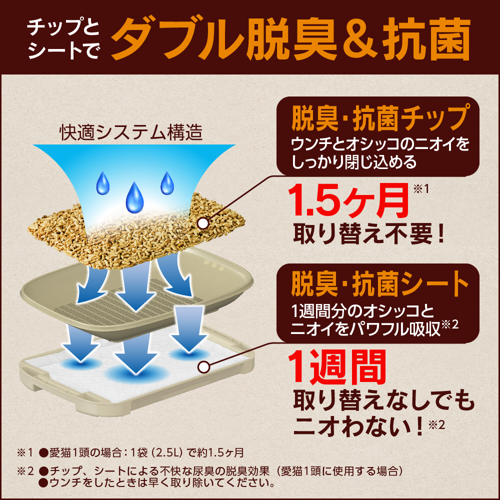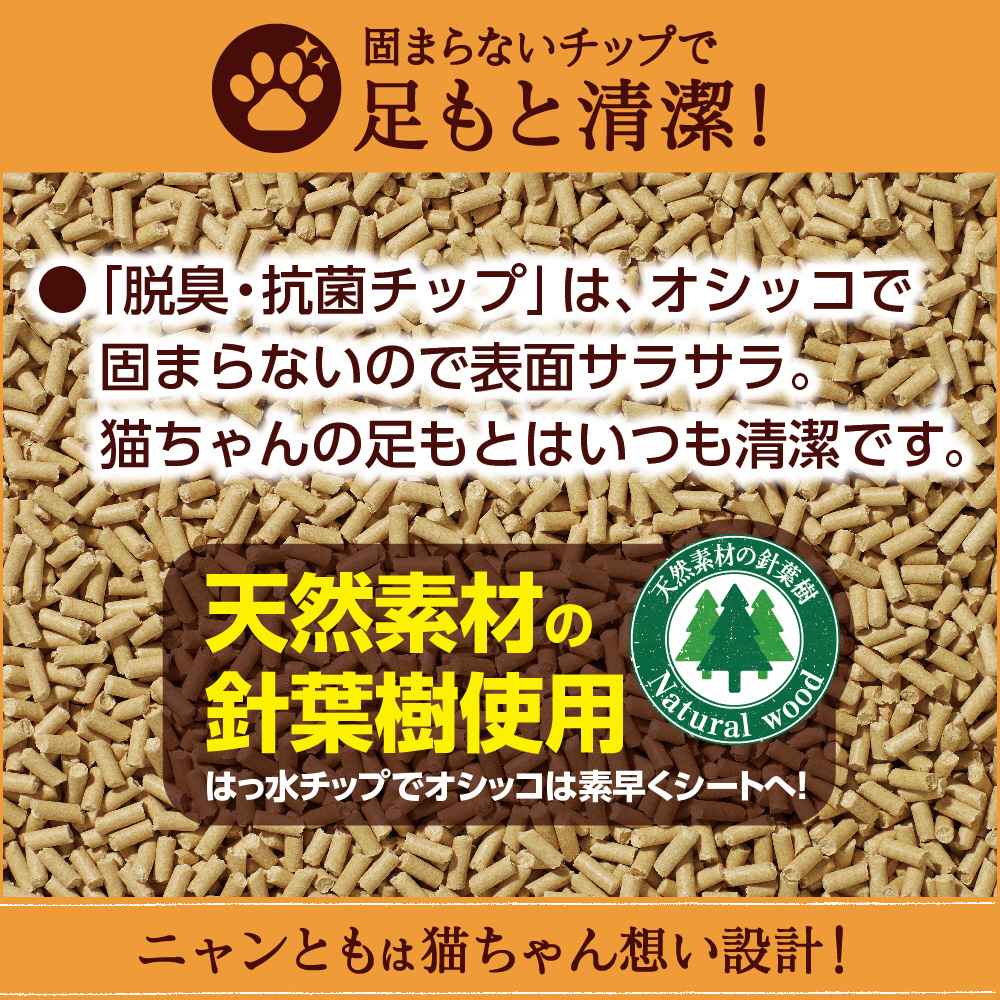 「脱臭・抗菌チップ」は、 オシッコで固まらないので表面サラサラ。猫ちゃんの足もとはいつも清潔です。