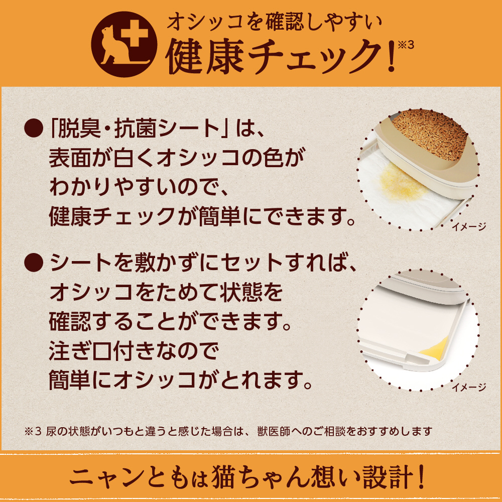 「脱臭・抗菌シート」 は、 表面が白くオシッコの色が わかりやすいので、健康チェックが簡単にできます。