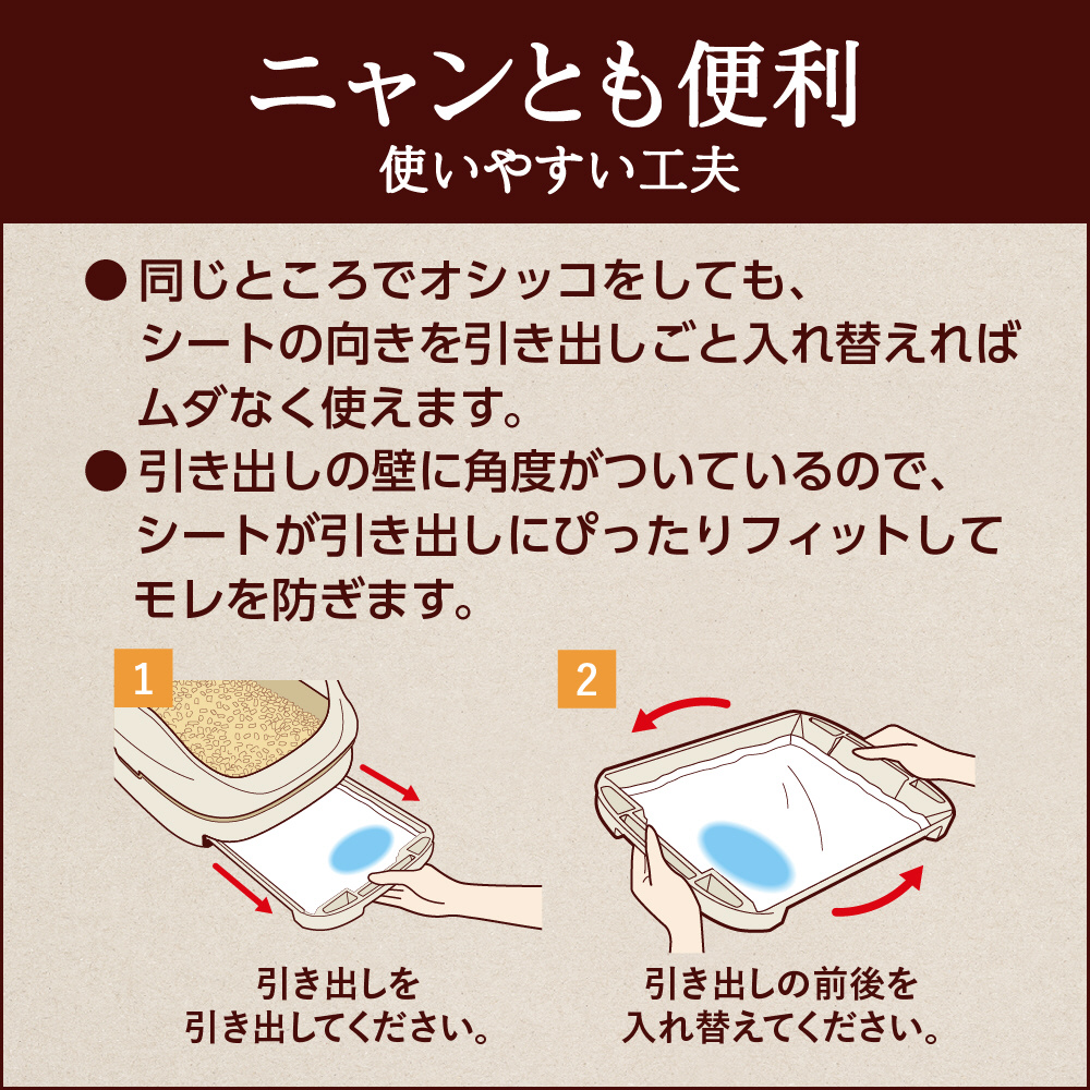 同じところでオシッコをしても、 シートの向きを引き出しごと入れ替えればムダなく使えます。