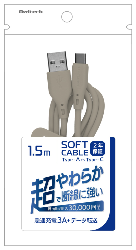 USB Type-A to USB Type-C シリコンケーブル 超やわらかで断線に強い 耐屈曲3万回以上 急速充電3A/データ転送 ミストグレー OWL-CBSRCA15-MGY