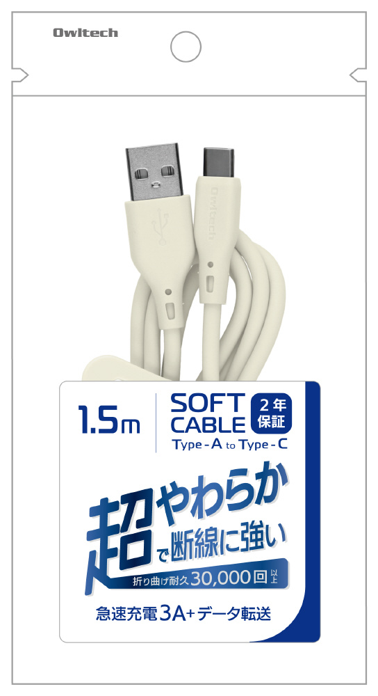 USB Type-A to USB Type-C シリコンケーブル 超やわらかで断線に強い 耐屈曲3万回以上 急速充電3A/データ転送 キナリ OWL-CBSRCA15-KI