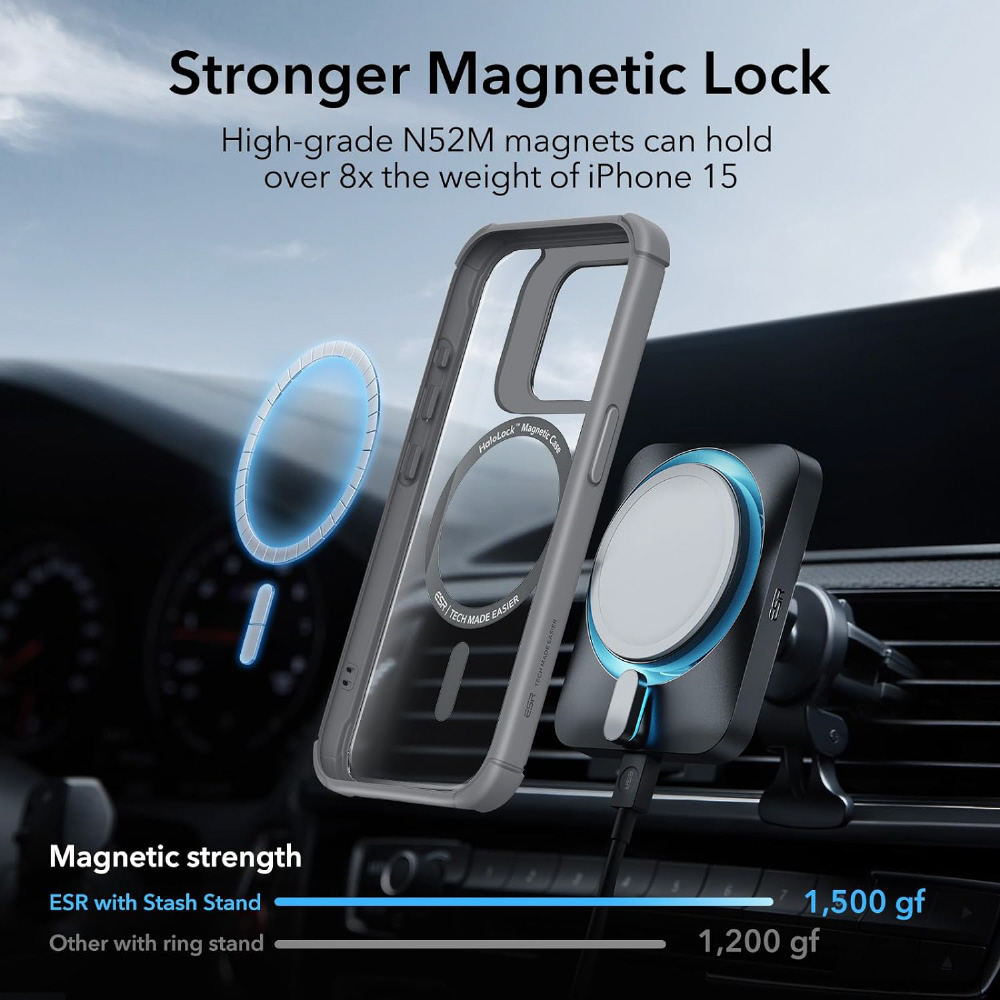 1,500 gの吸着力を持つ強力な内蔵磁石により、素早く簡単にワンタッチでワイヤレス充電が可能で、MagSafe互換性に100%対応し、すべての公式およびESR MagSafe充電器とアクセサリーを確実に吸着します。