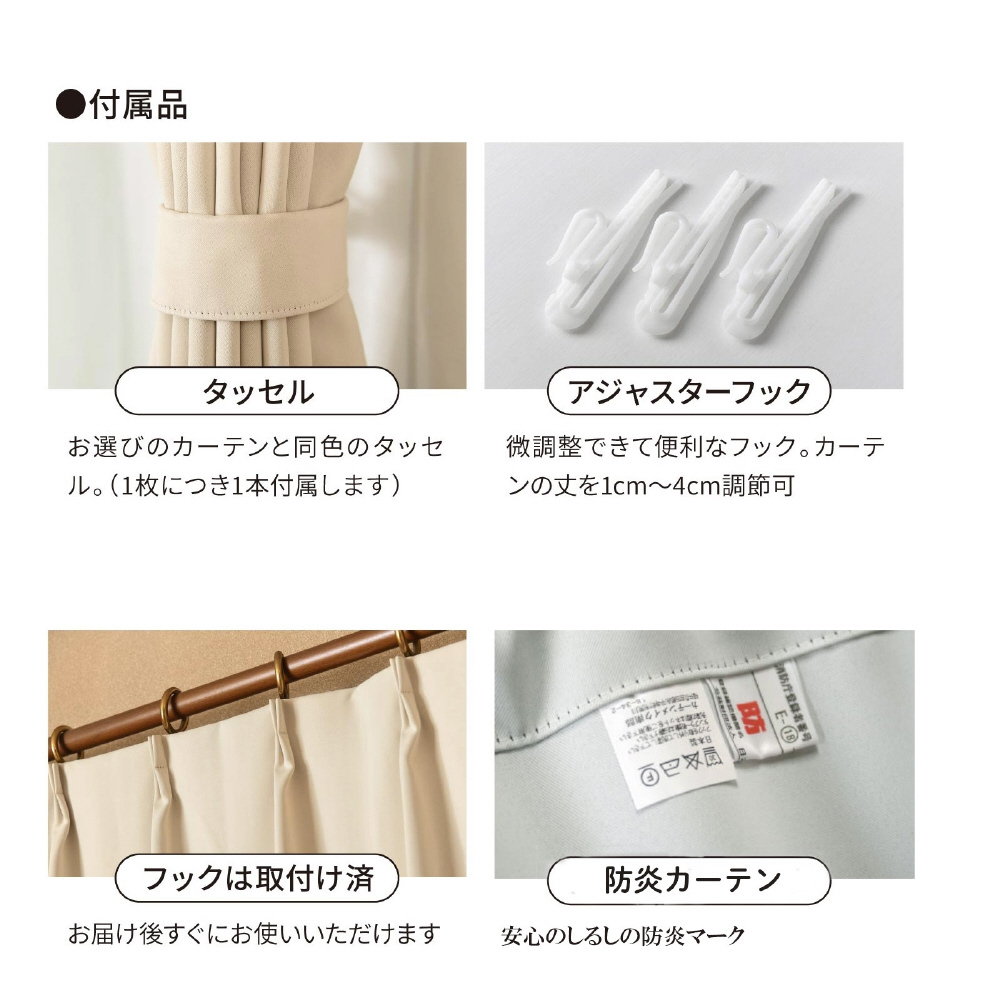 【サイズ】幅100×丈135cm(2枚組) 【機能】遮光1級、防炎、ウォッシャブル 【フック形状】アジャスターフック