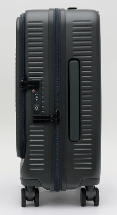 フロント部分はホテル等狭い場所でも開閉しやすい横開きタイプ。通常のスーツケースのように真ん中部分からファスナーを