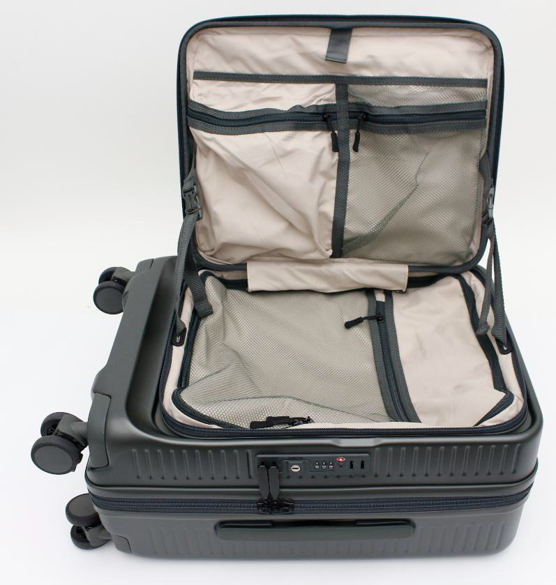 通常のスーツケースのように真ん中部分からファスナーを開閉することもできます。100席以上の航空機内持ち込み可能サイズ。