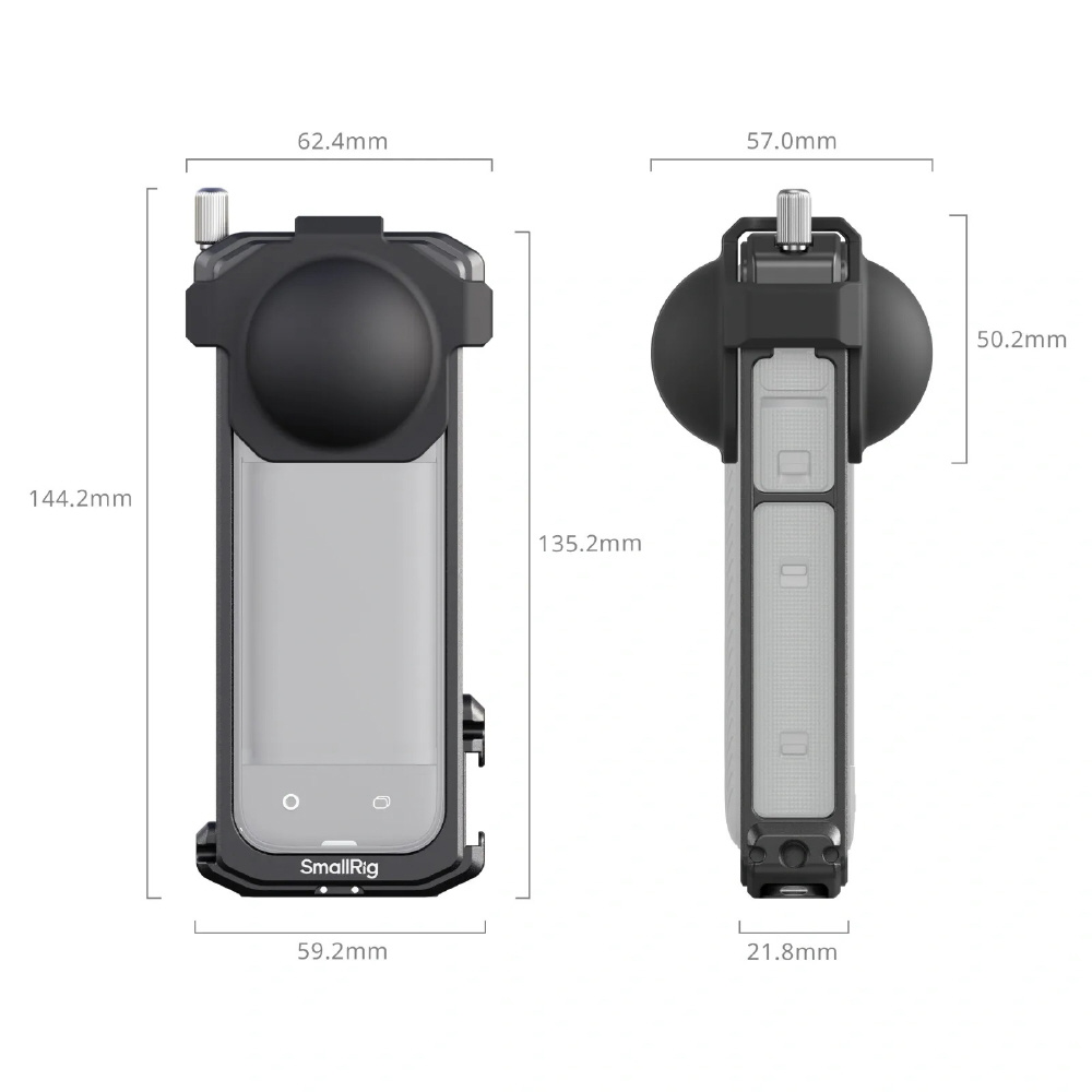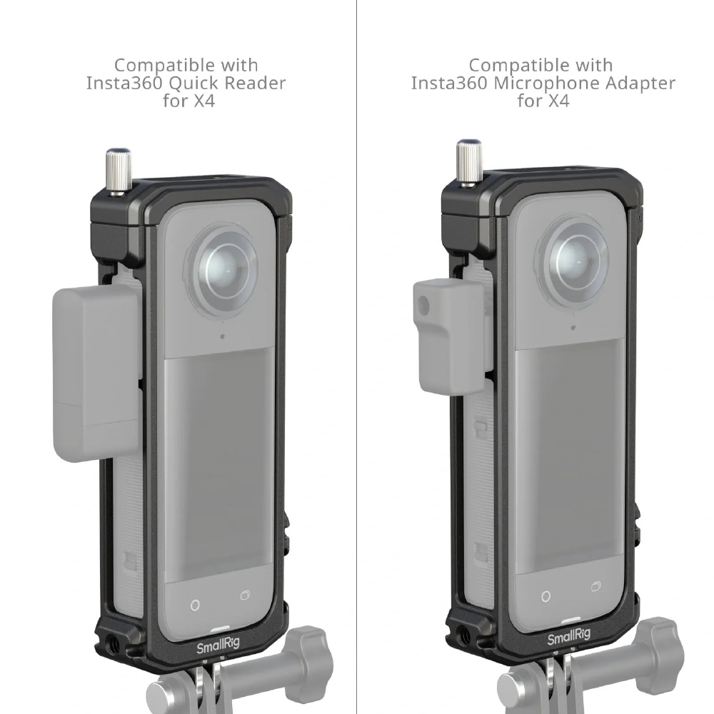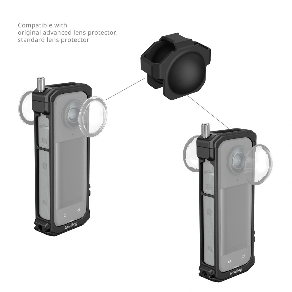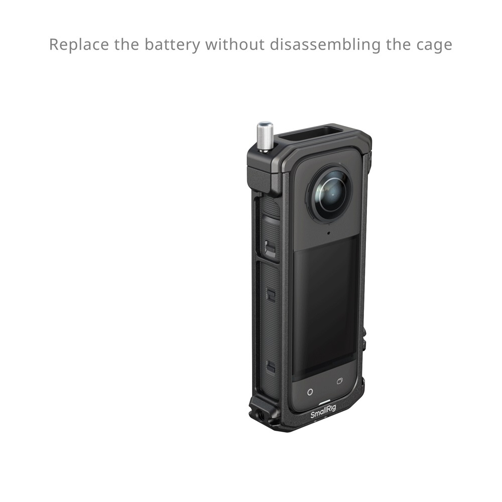 SmallRig Insta360 X4用ケージ4278は、カメラの保護と様々なインターフェース拡張アクセサリーを提供し、撮影時の利便性を向上させます。サイドギャップデザインを採用したケージは、バッテリードアへのアクセスを妨げないため、ケージを分解することなく素早くバッテリーを交換することができます。ケージはアクションカメラにぴったりとフィットし、カメラ本体に傷がつかないように内側にシリコンパッドが付いています。カメラは上部からケージに入れ、蝶ネジで固定するため、取り付けに工具は必要ありません。ケージにはコールドシューマウントと、マイクやLEDビデオライトなどの撮影アクセサリーを取り付けるための1/4”-20ねじれ防止ネジ穴が側面に付いています。また、1/4”-20ネジの三脚や自撮り棒(4758)などを直接取り付けるための1/4”-20ネジ穴も備えています。収納時にレンズを保護するシリコン製レンズキャップ付き。
