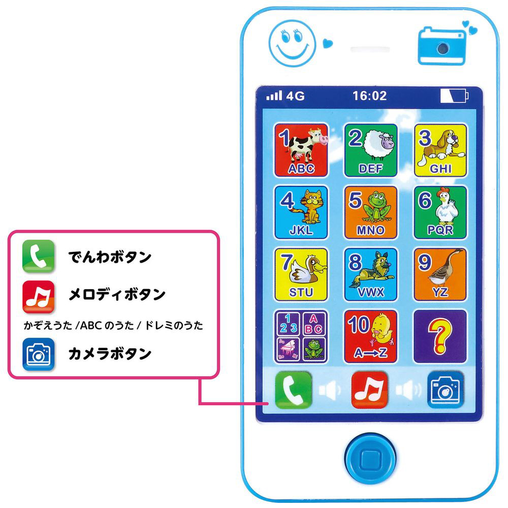 カメラやクイズなどいろいろなボタンに連動した機能があるので、たくさんの遊び方ができるスマートフォン型のオモチャ