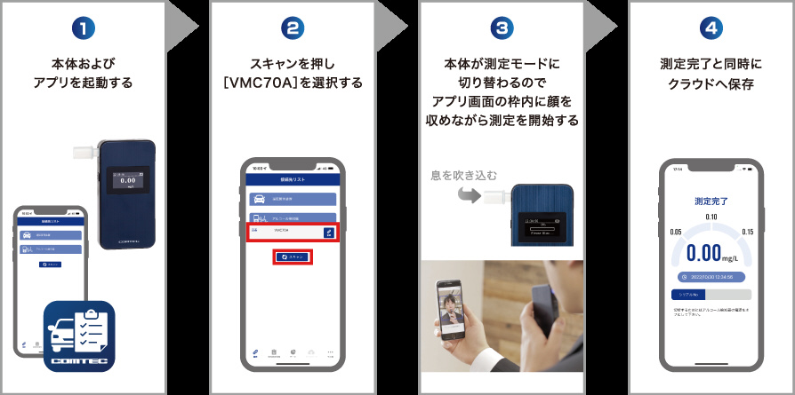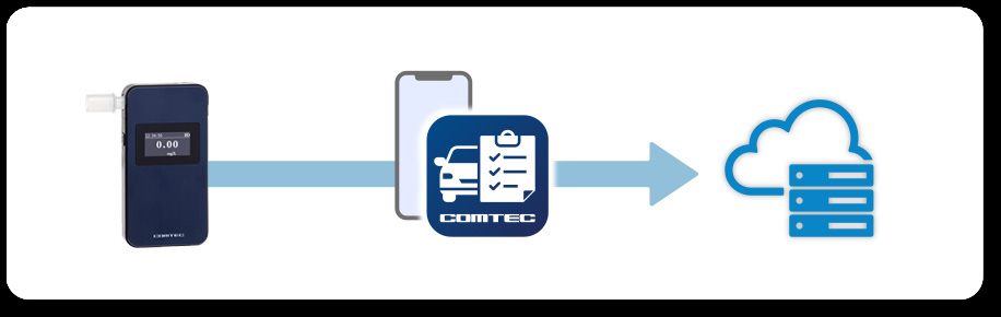 Bluetooth内蔵の本製品をスマートフォンアプリ「C-Portal mobile」と接続することで、C-Portalでアルコール検査のクラウド管理ができます。
