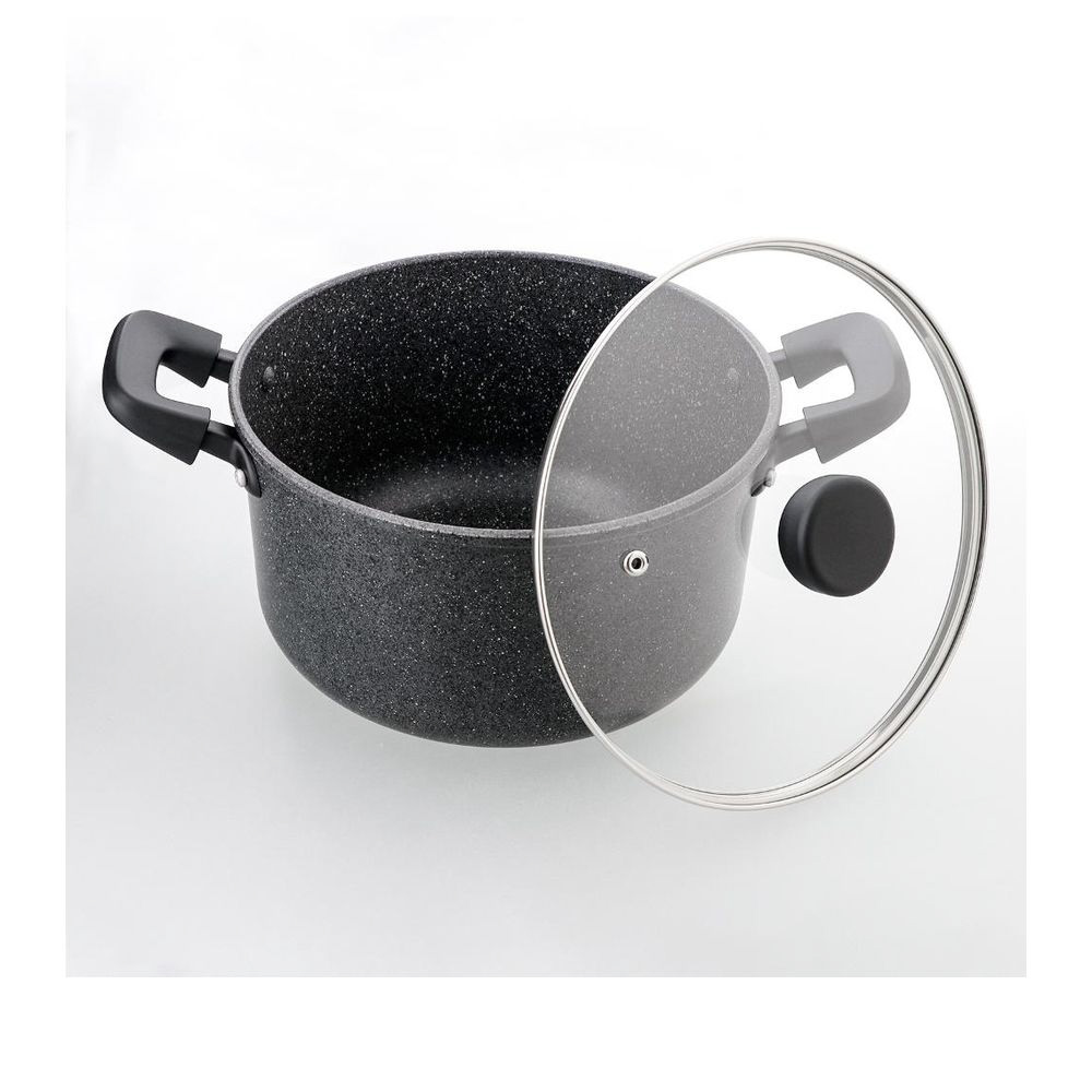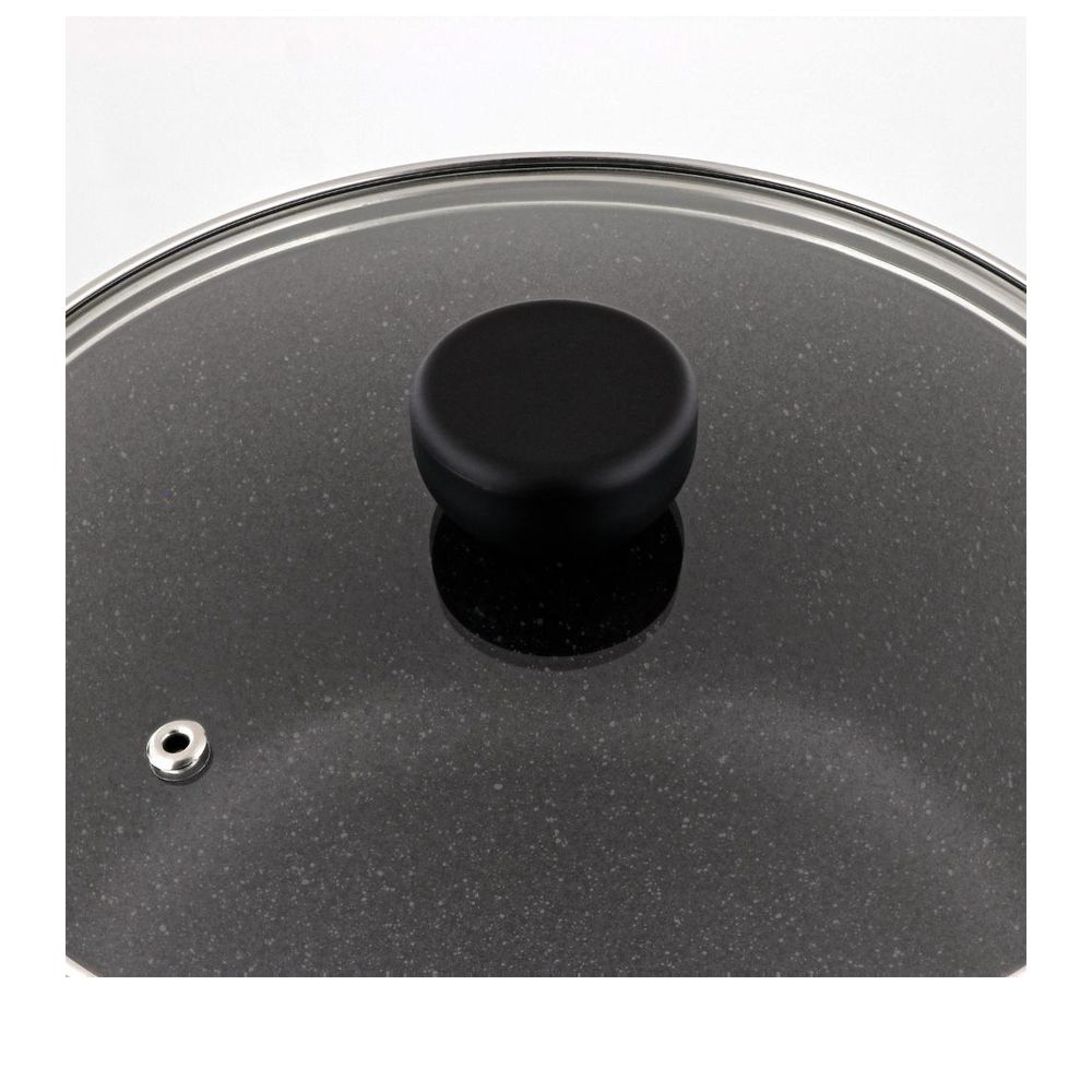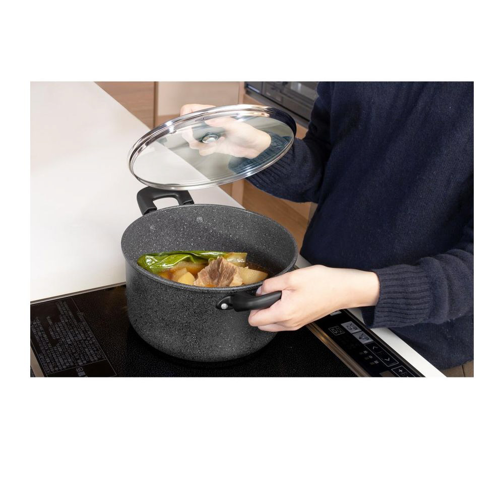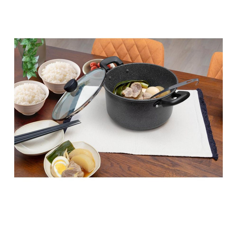 素材・材質:本体/アルミニウム合金、はり底/ステンレス鋼(クロム16%)(底厚2.7mmはり底含む)(24cmは3mm)、ハンドル・ツマミ/フェノール樹脂(耐熱温度150℃)、ナイロン(耐熱温度100℃)、ガラス蓋/全面物理強化ガラス、内面/ふっ素樹脂塗膜加工、外面/マーブル調焼付塗装