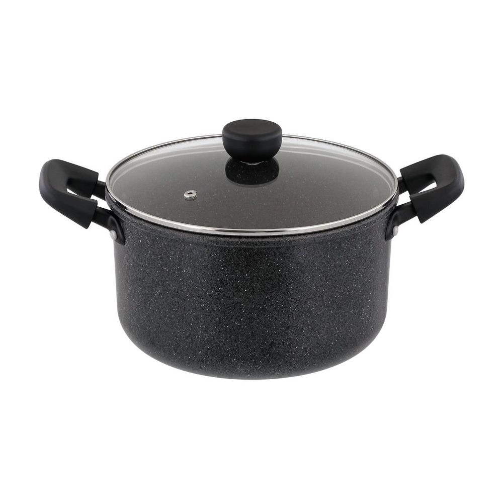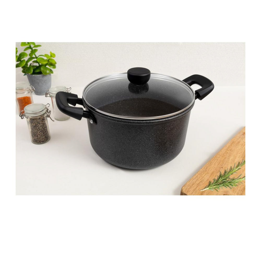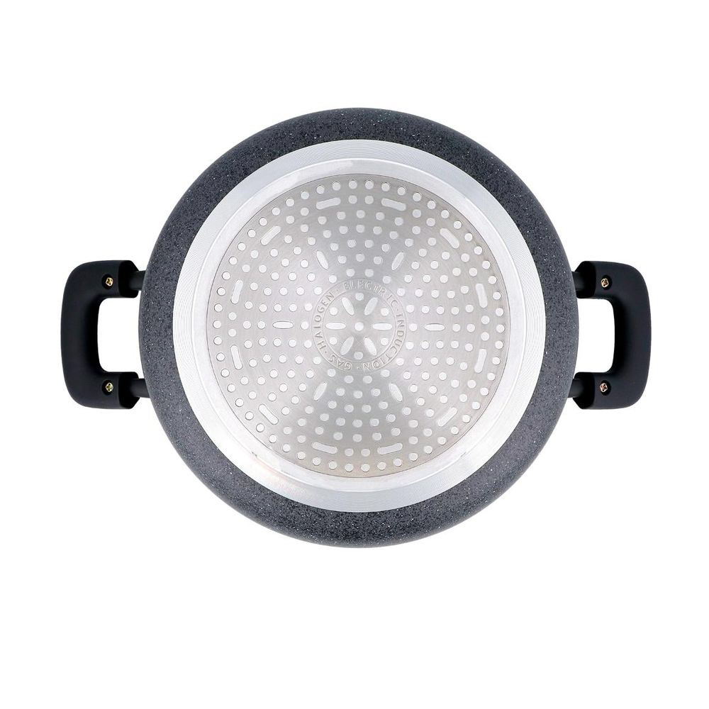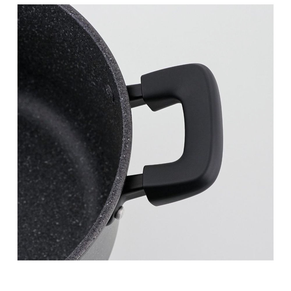 素材・材質:本体/アルミニウム合金、はり底/ステンレス鋼(クロム16%)(底厚2.7mmはり底含む)(24cmは3mm)、ハンドル・ツマミ/フェノール樹脂(耐熱温度150℃)、ナイロン(耐熱温度100℃)、ガラス蓋/全面物理強化ガラス、内面/ふっ素樹脂塗膜加工、外面/マーブル調焼付塗装