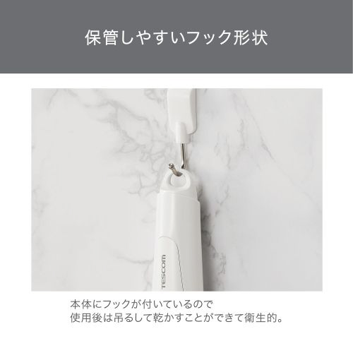 保管に便利なフック付き。使用後、水に濡れた際も吊るして乾かせます。