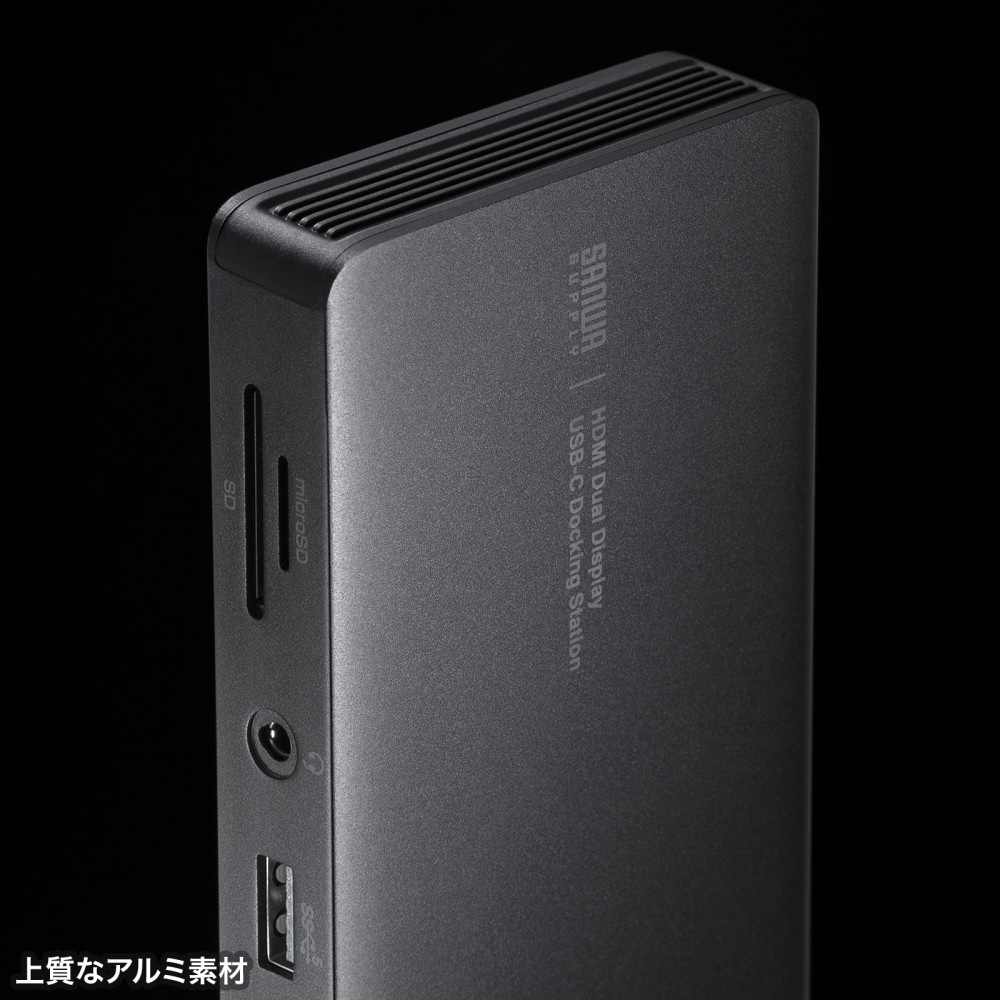 ■USB Type-Cケーブル1本でディスプレイ最大2台へ4K解像度の映像出力ができる、HDMI映像出力端子を2ポート搭載したUSB Type-Cドッキングステーションです。