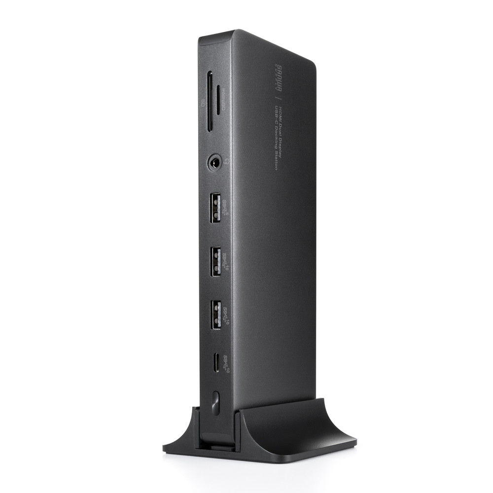 HDMI×2ポートの映像出力端子を備え、4K×2画面の映像出力に対応したドッキングステーション。専用ACアダプタ付き。