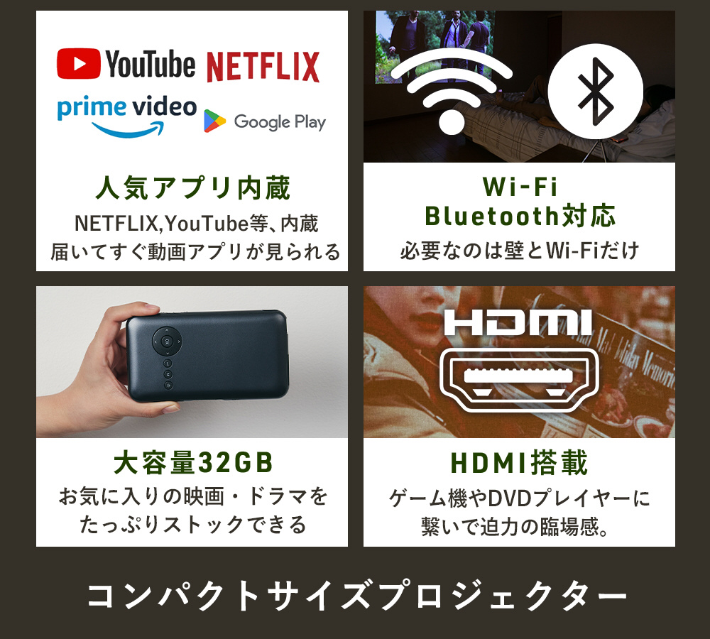 Wi-Fiやスマートフォンのテザリングがあれば、プロジェクター本体だけでYoutubeやネット映画が見られます。