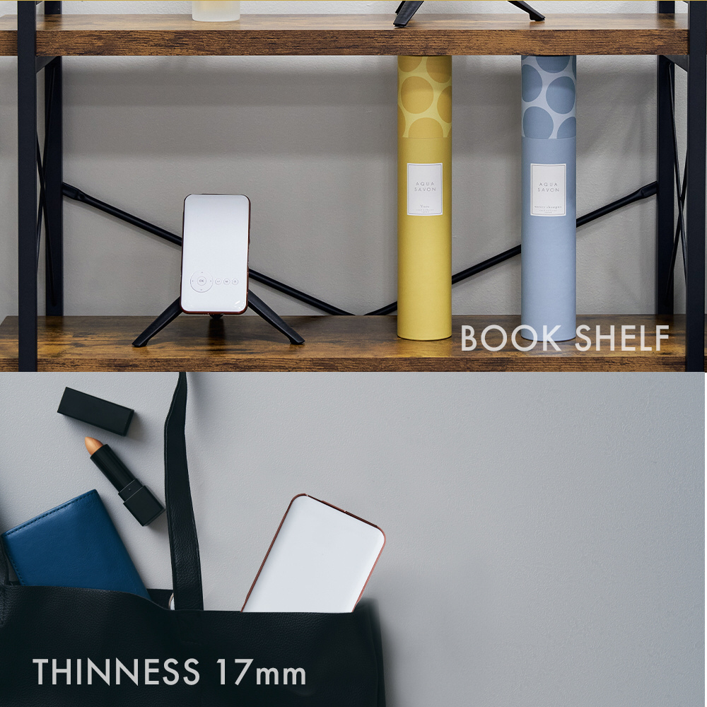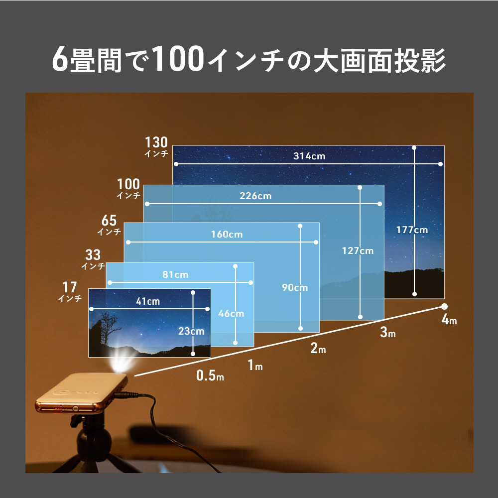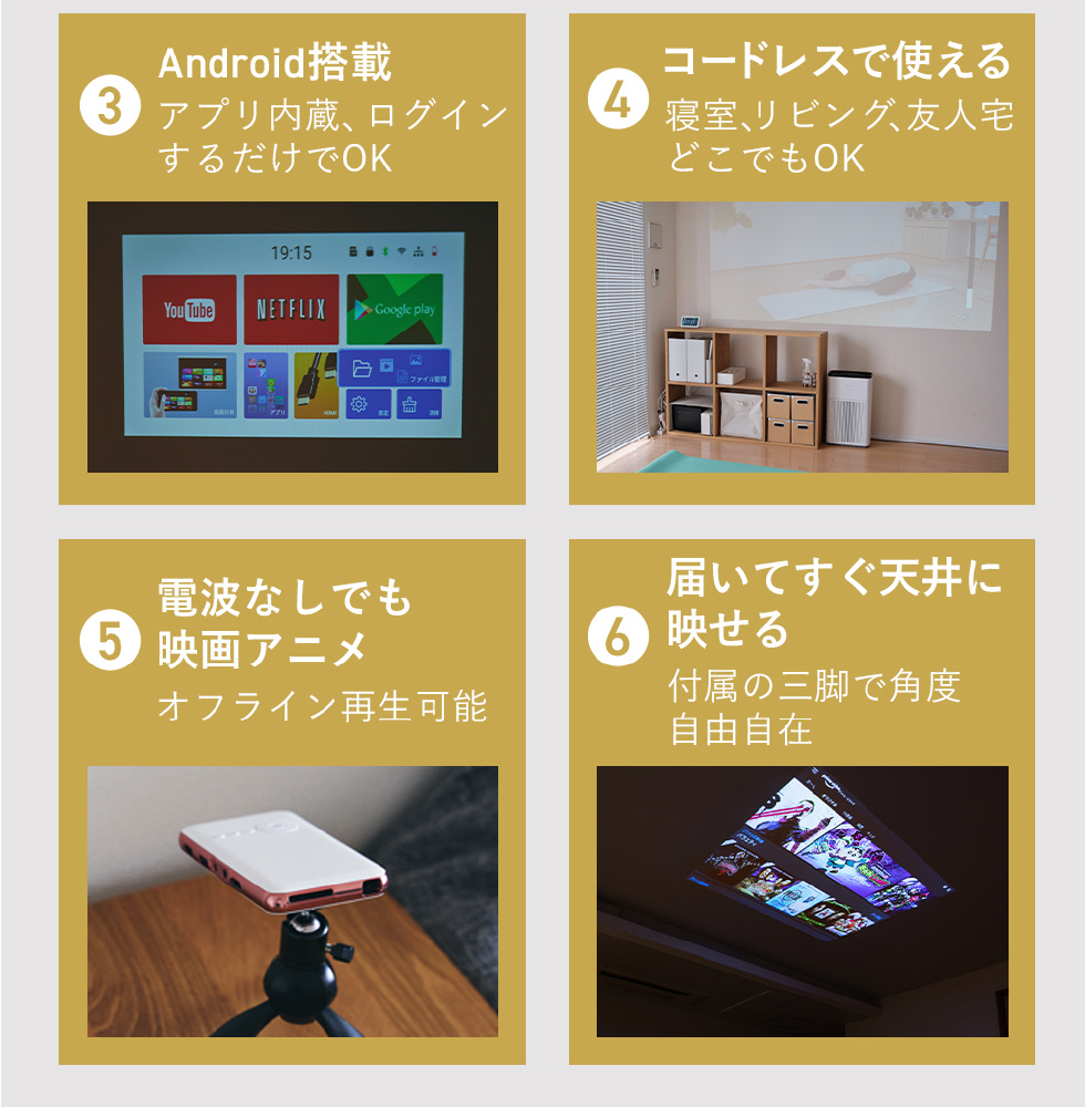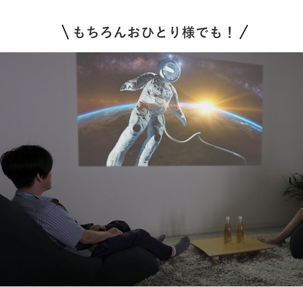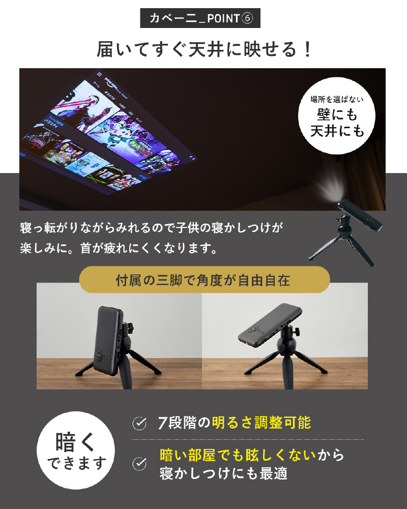 壁や天井に投影OK、スクリーン不要。必要なのは壁だけ! 付属の三脚で斜め〜直角に固定できるので、いい角度で天井に投影できます。