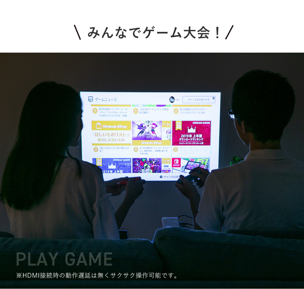 ゲーム機器やパソコンの画面を壁や天井に投影できます。Nintendo Switch(ニンテンドースイッチ)やPS3-5をつないで迫力の大画面でプレイ!