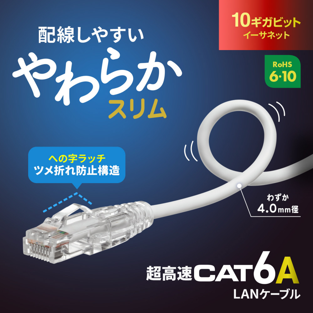 伝送速度10Gbps、伝送帯域500MHzに対応、やわらか素材と4.0mm径スリムケーブルとツメ折れ防止「への字ラッチ」コネクタ採用のカテゴリ6A LANケーブル。
