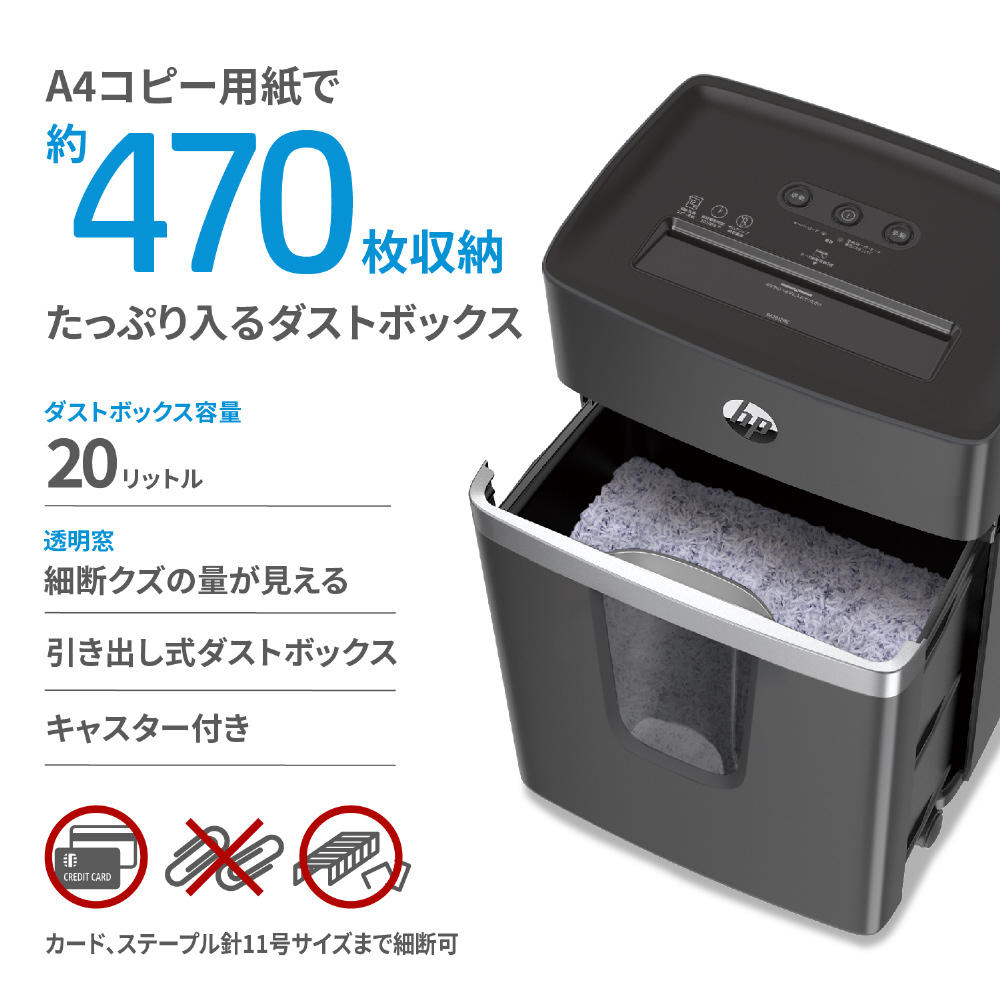 PCカテゴリー認知度No.1のHPブランドのシュレッダー。実用的な紙専用&マイクロカット大量細断仕様の操作環境と、高性能モーター+エアークーリングシステム+オートカッタークリーニングシステムの採用で耐久性と信頼性を向上。安心の18ヶ月長期製品保証。