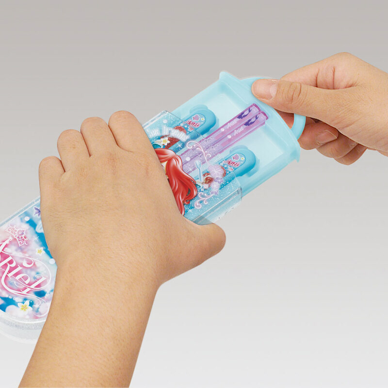 食器洗い乾燥機OKのお箸・フォーク・スプーンとケースのセットです。ケースは指で引き出すスライド式で、衝撃に強く丈夫な構造です。ケースは分解して洗えるから衛生的。おハシには名前を書けるスペース付き。ケース用の名前シールも付いてます。