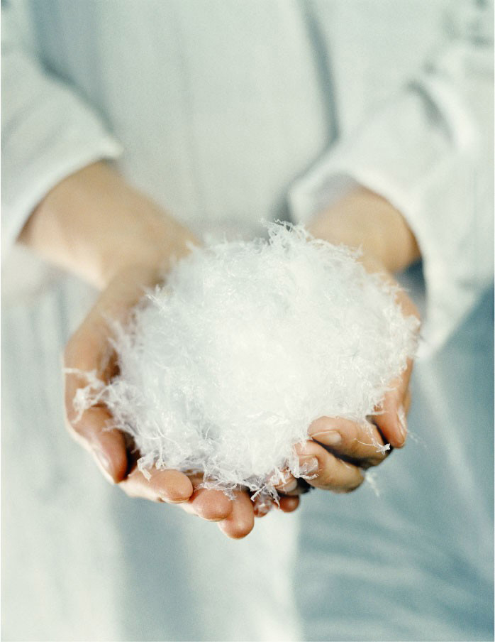デンマークで開発された特許素材で、ポリエチレン樹脂を極薄に引き伸ばしたフレイク形状の素材です。