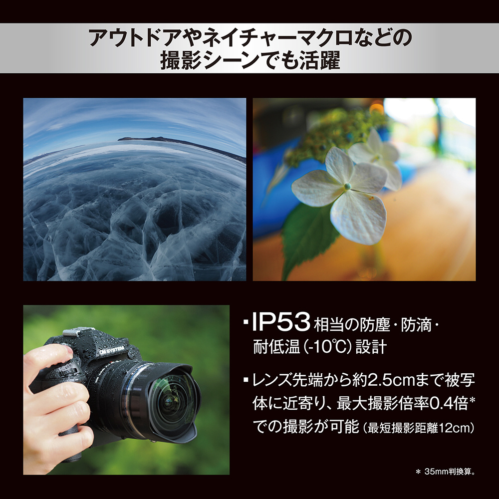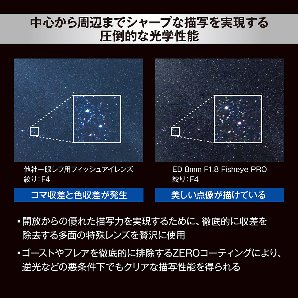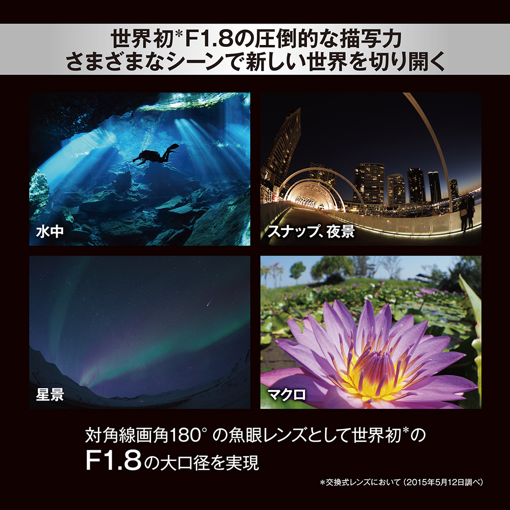 世界初※1の大口径F1.8と圧倒的な光学性能を併せ持つ対角線画角180°の魚眼(フィッシュアイ)レンズ。