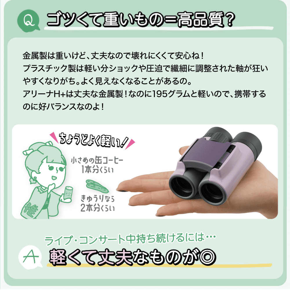 たたんだ大きさは6.6×9.2×4.6cm、軽量195g。バッグに入れても邪魔にならないキュートなボディながら中身は倍率8倍の本格的な双眼鏡。肉眼では見ることのできない臨場感、スケール感ある世界が広がります。