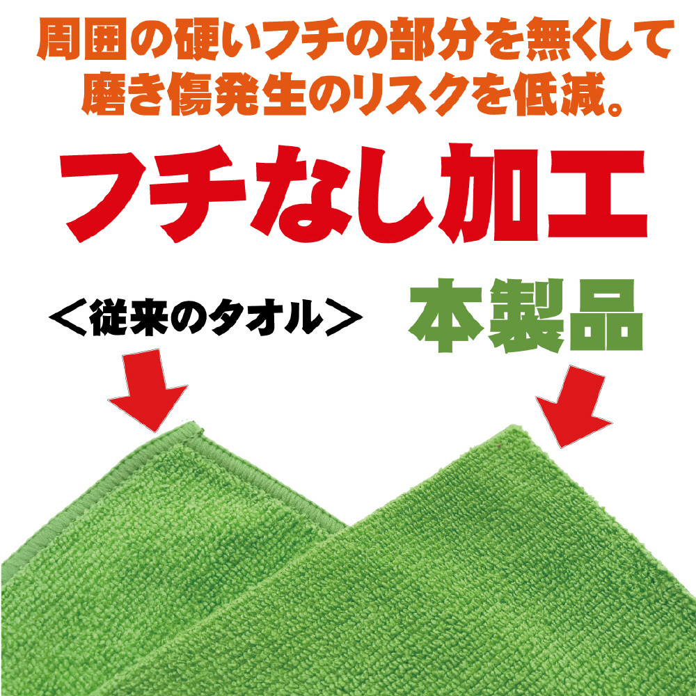 車に傷がつきにくいフチなし加工。洗車後の水分拭き取りに最適。高目付量生地でたっぷり吸水。
