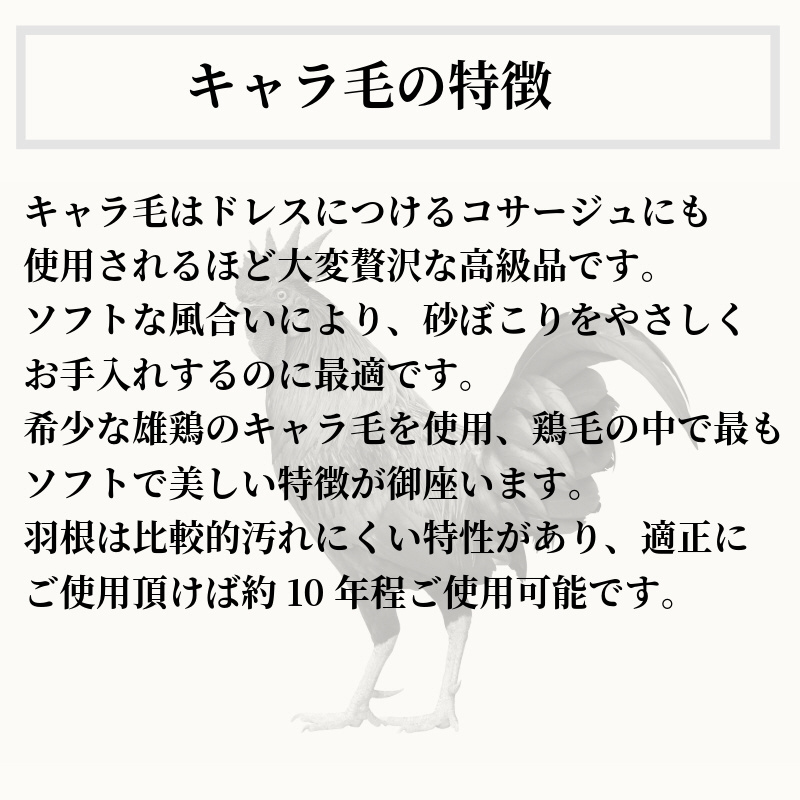 希少な雄鶏のキャラ毛を使用、鶏毛の中で最もソフトで美しい特徴が御座います。