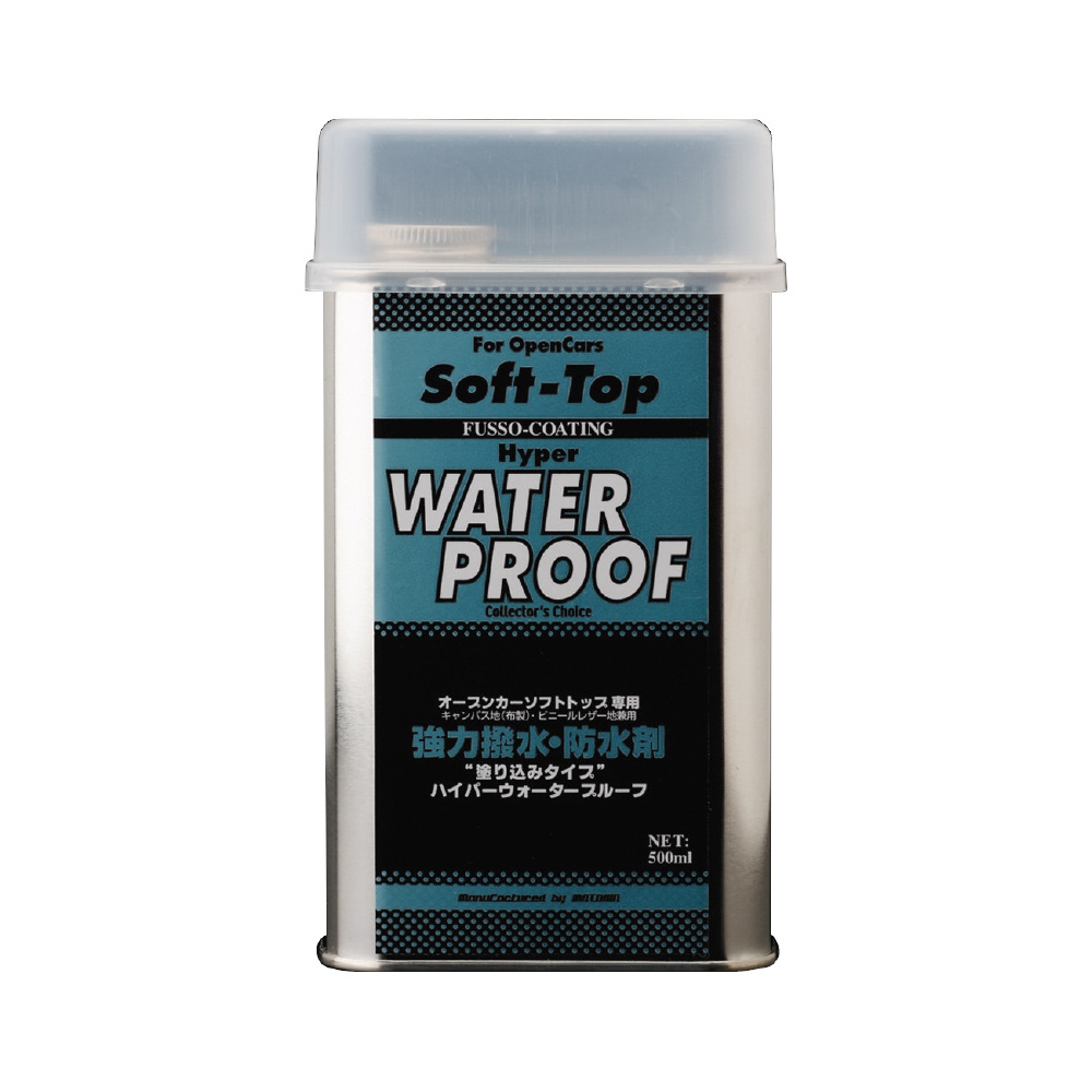 オープンカー幌(ソフトトップ)専用。ハイパーウォータープルーフはキャンバス地(布製)、ビニールレザー地のオープンカー幌専用に開発した強力撥水・防水剤です。効果が持続する塗り込みタイプ。 雨などによる、幌表面の水滴をフッ素コートで強力にブロック。雨天走行時の不安を解消します。