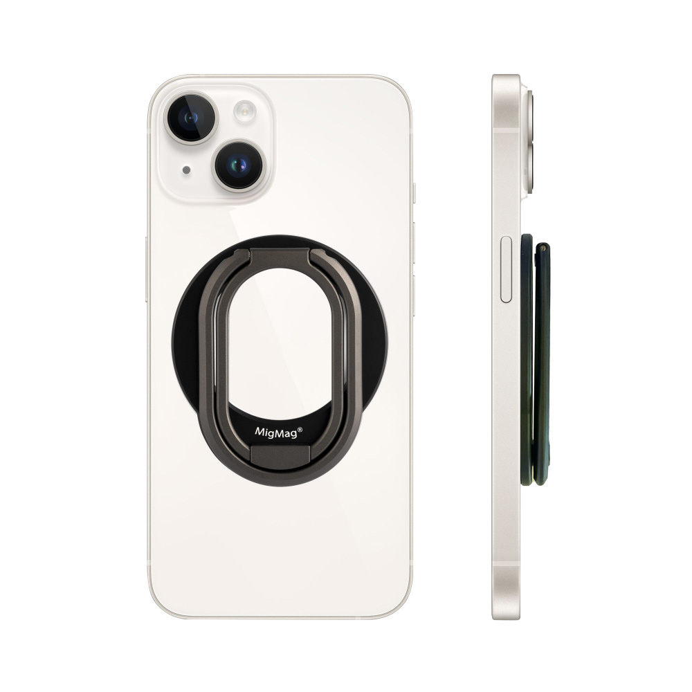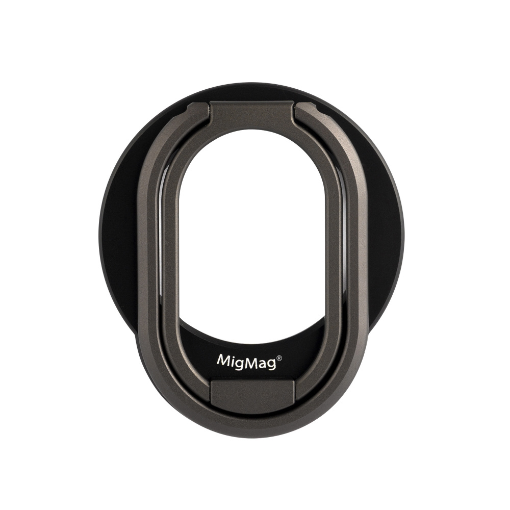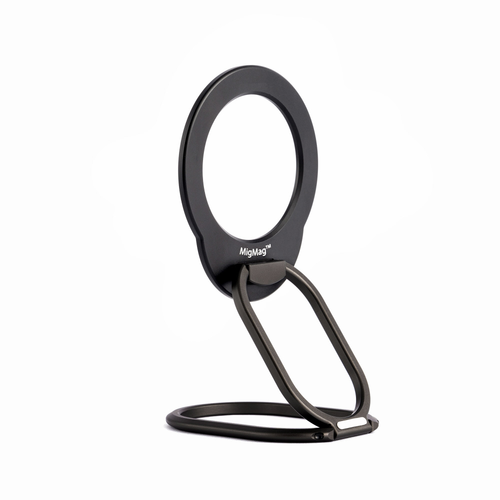 MigMagは単なるスマホリングとは違い2つの関節で自由な角度調整が可能なスタンド機能を備えています。リング部分には、スタンドとしても使用できる折りたたみ式の機能があり、テーブルやデスクにスマートフォンを立てかけることができます。また、リングはスマホホルダーとしても機能し、指を通したままでの安定した撮影やビデオチャットが可能です