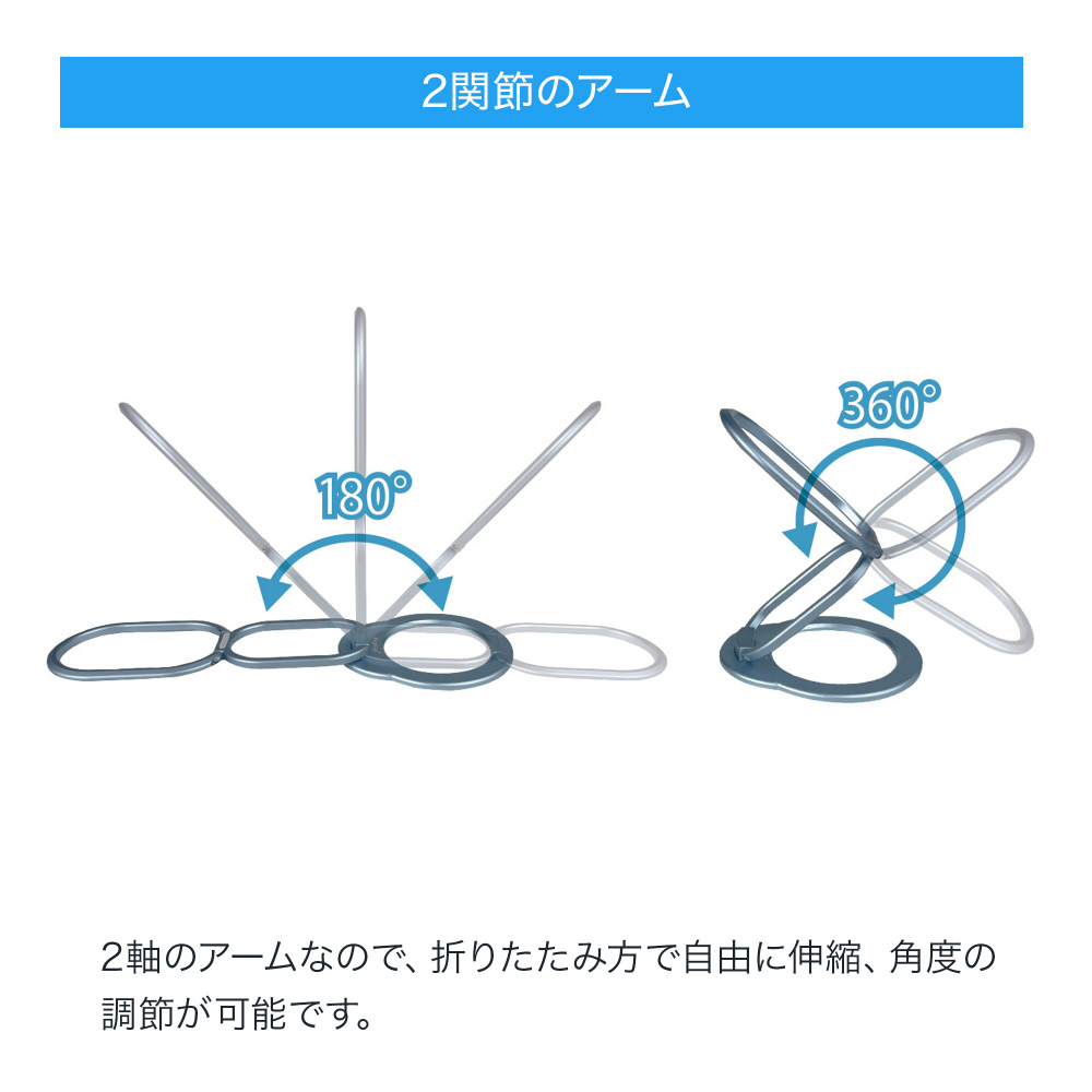 長いアームを持ち、スマホリングをフックとして使用することができます。キッチンでのレシピを見たりするときも使え、置く場所がなくても引っかける場所があれば動画視聴も可能です。さらに、2関節のアームで角度を調整できます。