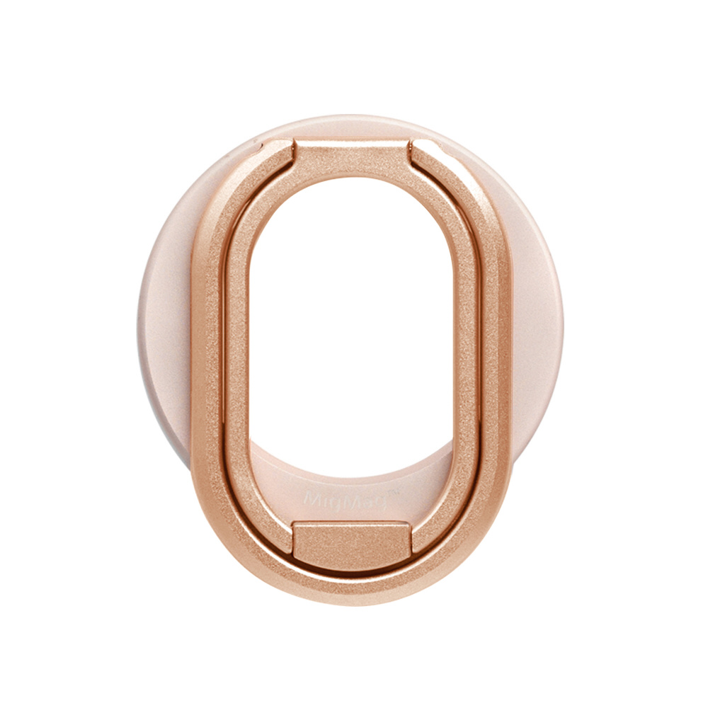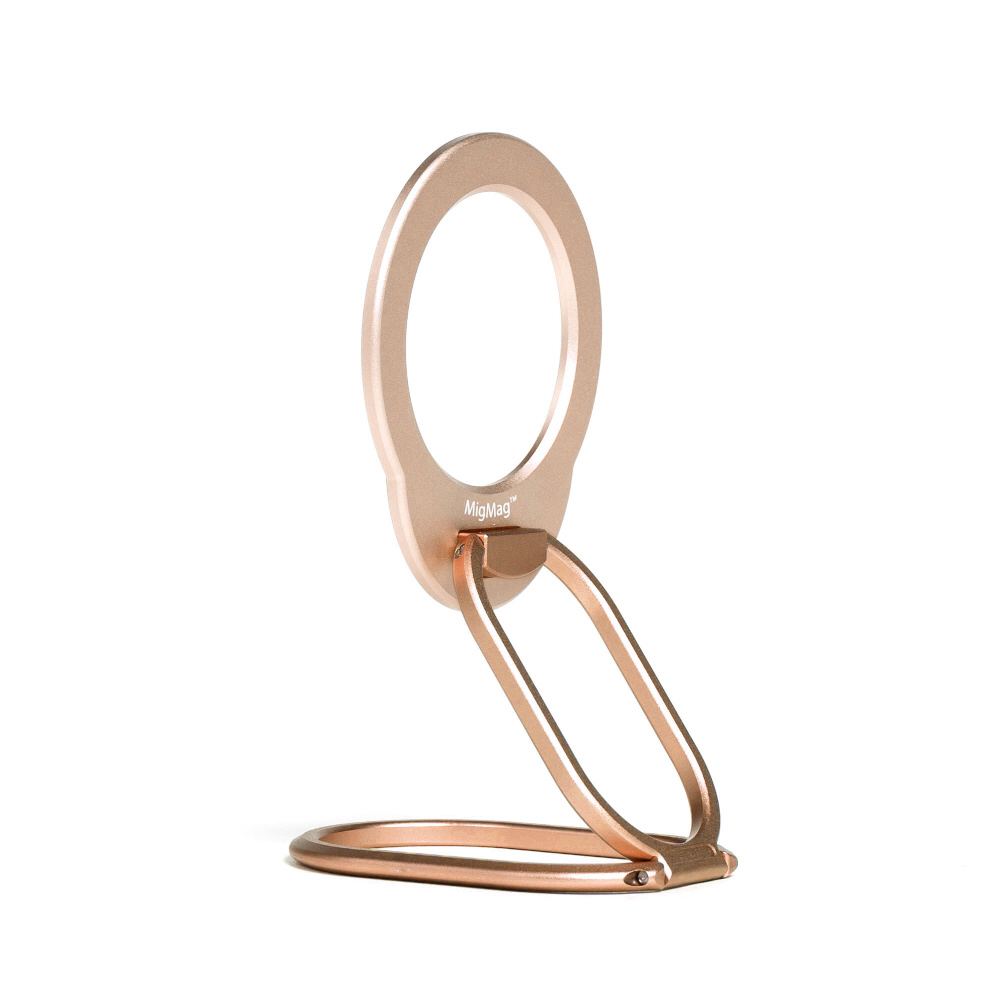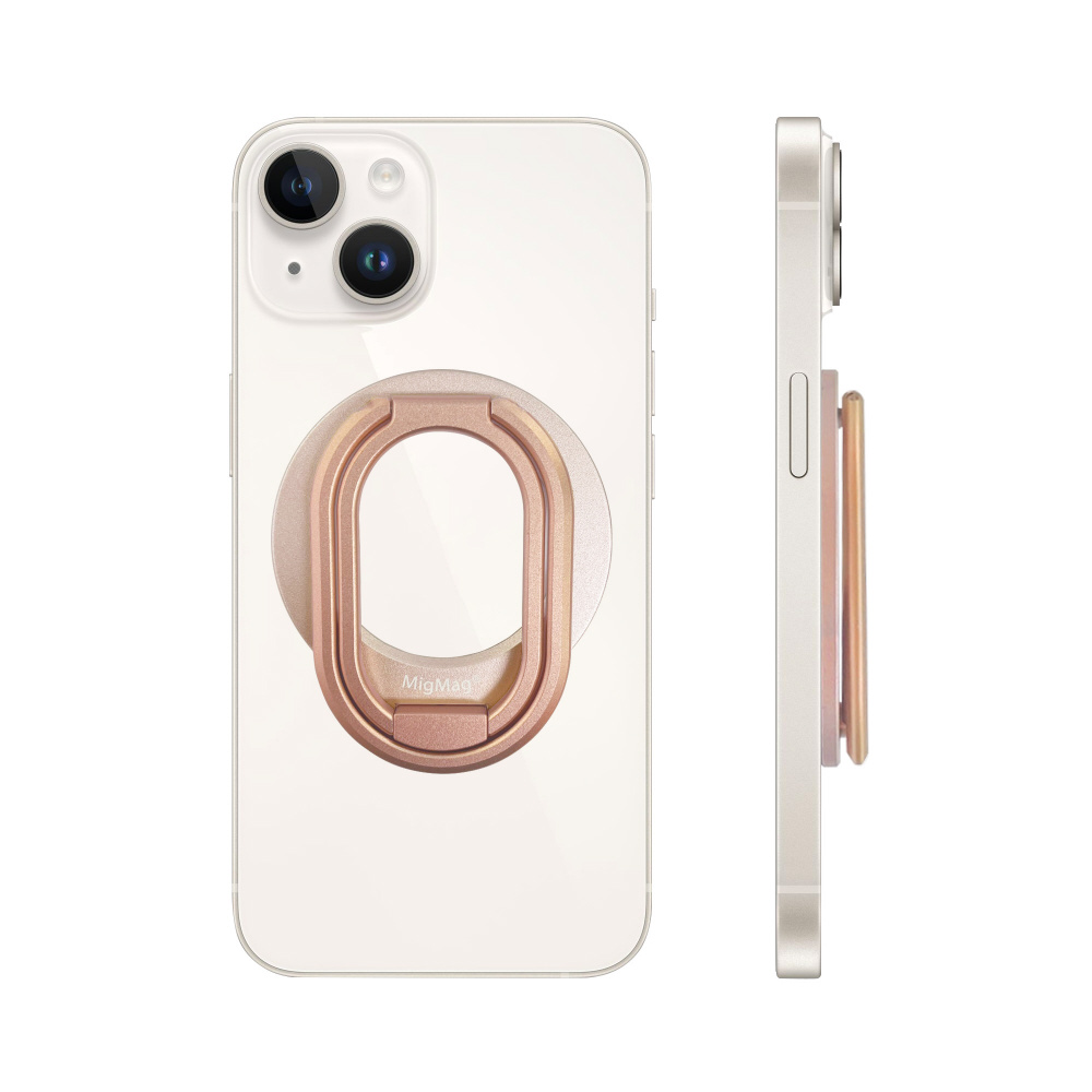 MigMagは単なるスマホリングとは違い2つの関節で自由な角度調整が可能なスタンド機能を備えています。リング部分には、スタンドとしても使用できる折りたたみ式の機能があり、テーブルやデスクにスマートフォンを立てかけることができます。また、リングはスマホホルダーとしても機能し、指を通したままでの安定した撮影やビデオチャットが可能です