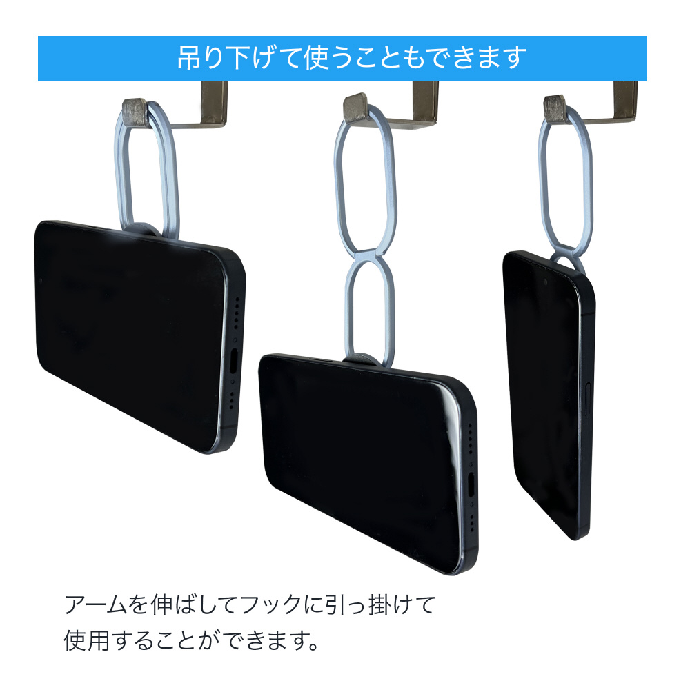 長いアームを持ち、スマホリングをフックとして使用することができます。キッチンでのレシピを見たりするときも使え、置く場所がなくても引っかける場所があれば動画視聴も可能です。さらに、2関節のアームで角度を調整できます。