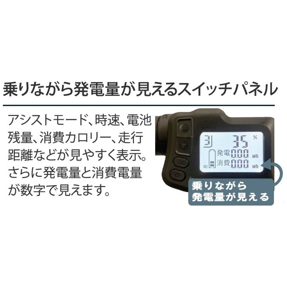 走行中に左ブレーキを使って止まる際や、下り坂で発電します。発電量、消費電量はスイッチパネルで乗りながら数字で見ることができます。