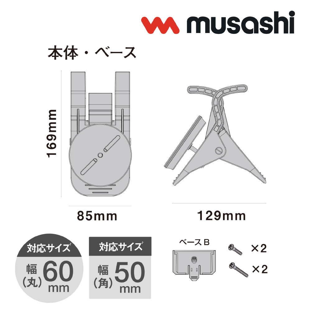 仕様1 対応サイズ 幅(丸):60mm、幅(角):50mm