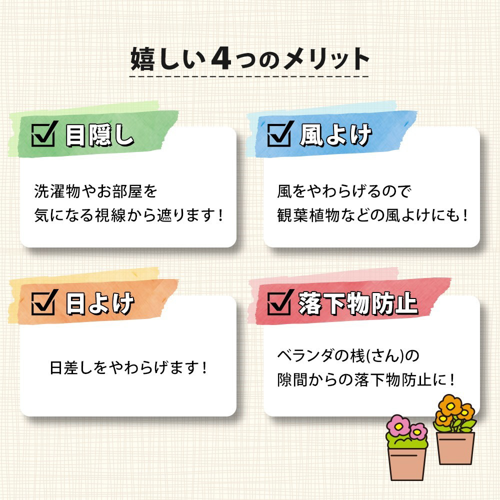 メッシュ生地が風をやわらげるので、観葉植物などの風よけ・日よけ・ベランダの桟(さん)の隙間からの落下物防止にも。