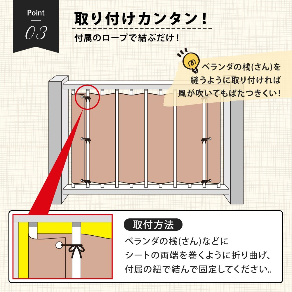ベランダの桟を縫うように取り付ければ、風が吹いてもばたつきにくく安心です。
