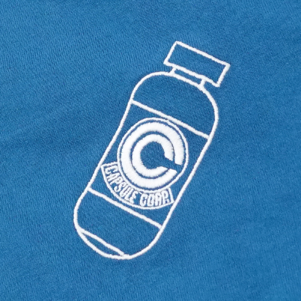 作中に登場する『カプセルコーポレーション』のマークをデザインした大判プリントが目を惹きます。