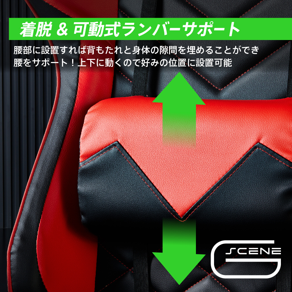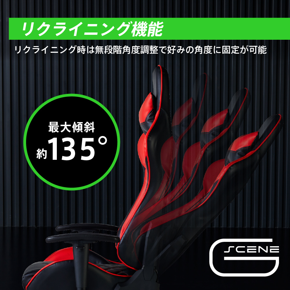 背もたれが135度まで倒せてリラックスポジションが作れます。高さが調節できる3Dヘッドレスト、ランバーサポートクッション付きで長時間のゲームプレイをサポートします。