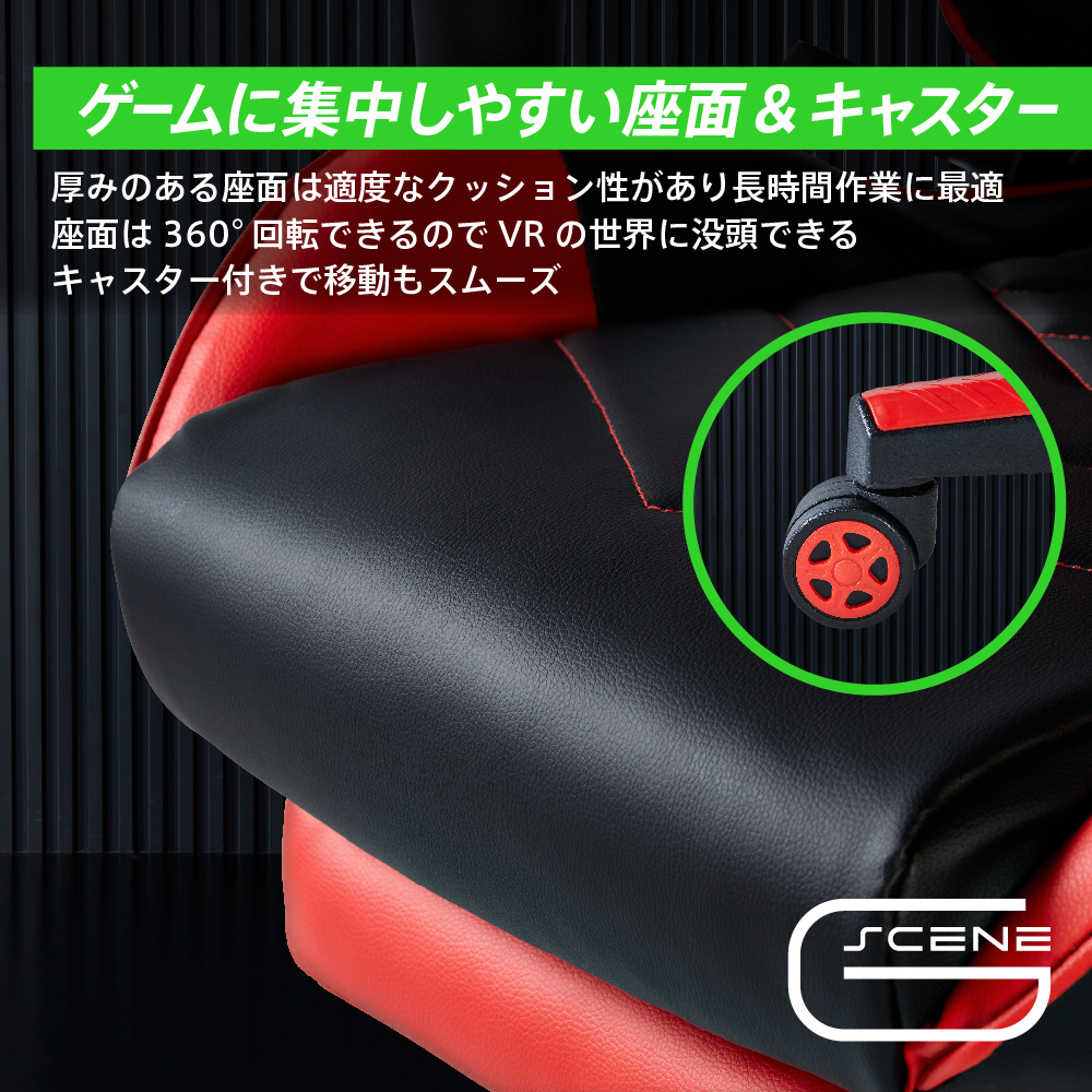 厚みのある座面は適度なクッション性があり長時間作業に最適。座面は360°回転できるのでVR の世界に没頭できる。キャスター付きで移動もスムーズ。