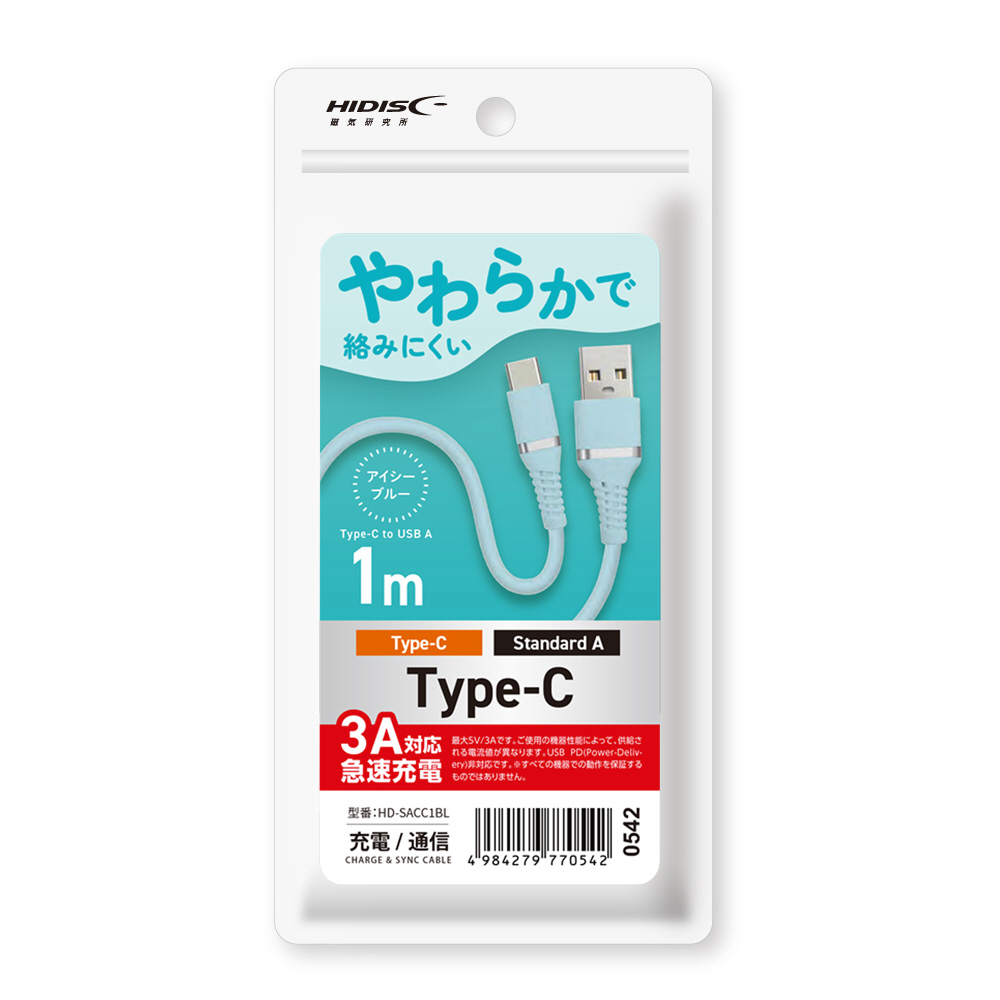HIDISC 柔らかで絡みにくい USB Type-A to Cケーブル 1m アイシーブルー 急速充電3A対応 HIDISC HD-SACC1BL [USB-A ⇔ USB-C]