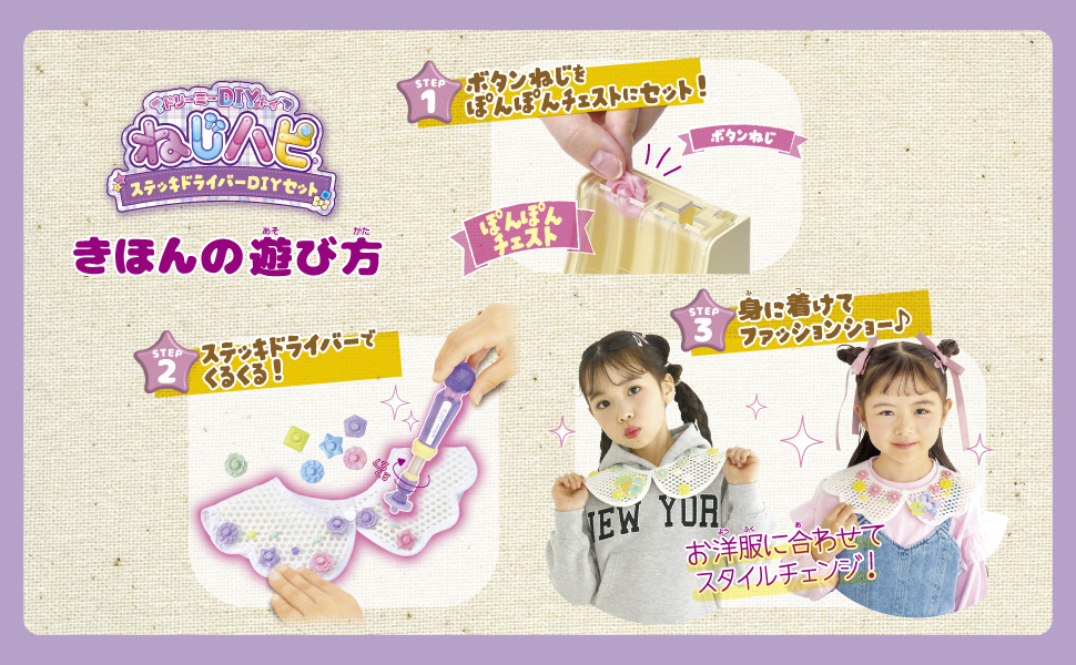ステッキドライバーで専用ボタンねじをえりに留めて、自分だけのファッションアイテムをDIY!